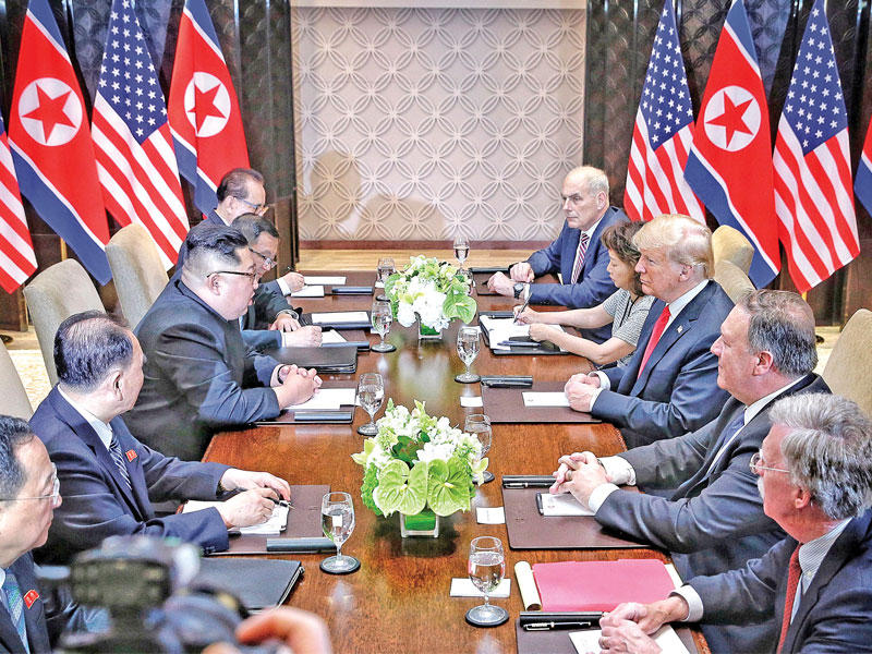 • الرئيس الأميركي يتعهد بوقف المناورات مع الجنوب ويبقي العقوبات على بيونغ يانغ وسيدعو نظيره الكوري الشمالي إلى البيت الأبيض «في الوقت المناسب»