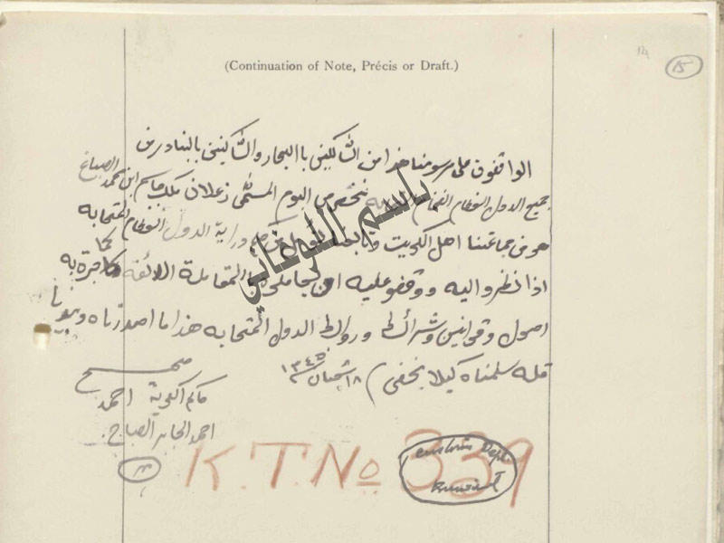 وإليكم نص وثيقة اليوم كما ورد: "الواقفون على مرسومنا هذا من السالكين بالبحار والساكنين بالبنادر من جميع الدول العظام الفخام المتحابة، من خصوص البوم المسمى زعلان ملك جاسم بن محمد الصباغ، هو من جماعتنا أهل الكويت وتابعنا. نأمل من حكم ودراية الدول العظام المتحابة إذا نظروا إليه ووقفوا عليه أن يعاملوه بالمعاملة اللائقة كما جرت به أصول وقوانين وشرائط وروابط الدول المتحابة.هذا ما أصدرناه وبيدنا كله سلمناه، كيلا يخفى 18 شعبان 1345هـ.صحيح حاكم الكويت أحمد الجابر الصباح".في المقال المقبل سننشر وثائق أخرى مشابهة بإذن الله تعالى.