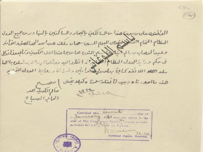 هذا ما أصدرناه وبيدنا نقله سلمناه، كيلا يخفى 14 شعبان 1349هـ.صحيح حاكم الكويت أحمد الجابر الصباح".والحديث عن حمد الصقر، رحمه الله، حديث طويل، لما لهذه الشخصية الكبيرة من أثر عميق في تاريخ الكويت، لذلك أكتفي في هذا المقال الصغير بالقول إنه من مواليد عام 1860 تقريباً، واشتغل بالتجارة طيلة حياته، وكانت له أملاك كثيرة وكبيرة في البصرة والفاو، حيث كان يزرع النخيل في هذه البساتين، ويبيع محاصيلها على تجار التمور من أهل الكويت، ضمنهم جد والدي سعد بن عبدالعزيز اللوغاني، رحمه الله، ويتم تصدير هذه المحاصيل إلى الهند للبيع في أسواقها. وقد بلغت نسبة التمور التي تستجلب من بساتين حمد الصقر نحو 70 في المئة من إجمالي تمور الكويت المصدرة إلى الهند، فلقبه الناس بـ"ملك التمور". وكانت له مكاتب تجارية في الهند واليمن والبصرة، ويتعامل معه كبار التجار في الخليج. عينه أمير الكويت المرحوم الشيخ أحمد الجابر الصباح في عام 1921 رئيساً لمجلس الشورى، وهو أول مجلس سياسي شعبي في الكويت. له أعمال خيرية ومساهمات مالية في مشاريع كويتية عديدة، من أبرزها بناؤه لمسجد الصقر بفريج البدر في الحي القبلي عام 1907. توفي رحمه الله تعالى عام 1930. في المقال المقبل سننشر وثيقة أخرى تتعلق بحصر ورثة التاجر الكبير حمد العبدالله الصقر ووصيته قبل وفاته بشهادة ثابتة من شهود أجلاء.