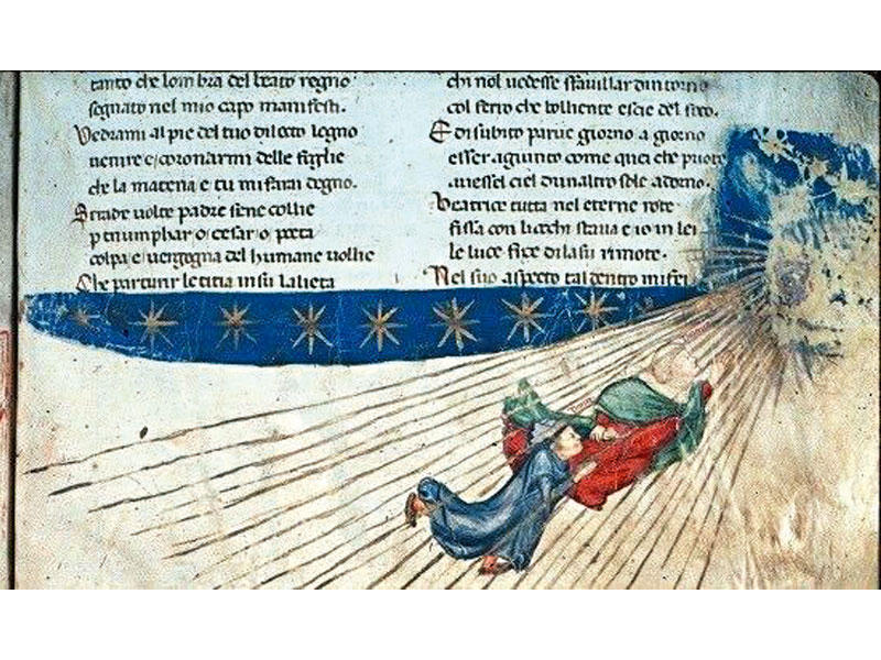 «في منتصف طريق حياتنا، وجدت نفسي في غابة مظلمة إذ ضللت سواء السبيل..آه ما أصعب وصف هذه الغابة الموحشة الكثيفة القاسية التي تجدد ذكراها لي.. الخوف.إنها شديدة المرارة حتى لا يكاد الموت يزيد عنها، ولكن كي أتناول ما وجدت هناك من خير، سأتكلم عن أشياء أخرى وجدتها فيها.لا أحسن أن أقول كيف دخلتها، فقد كنت مثقلاً بالنوم في اللحظة التي حدت فيها عن طريق الصواب.لكن بعدما بلغت أسفل تل ينتهي عنده ذلك الوادي الذي مزق مرآة قلبي من الخوفنظرت إلى أعلى ورأيت منكبيه وقد كستهما أشعة الكوكب الذي يهدي الناس في كل طريق.عندئذ هدأ قليلًا الخوف الذي بقي في بحيرة قلبي طوال الليلة التي قضيتها في أسى شديد».