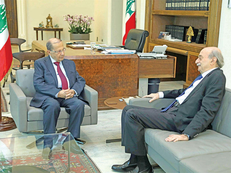 بعد يومين من لقاء رئيس الجمهورية اللبنانية ميشال عون زعيم حزب القوات اللبنانية سمير جعجع، لمناقشة ملف تشكيل الحكومة الجديدة، التي يشهد عراقيل وعقداً، استقبل عون في قصر بعبدا، الزعيم الدرزي وليد جنبلاط لمناقشة مسار التأليف، الذي يقوده رئيس الحكومة المكلف سعد الحريري بكل هدوء وتأنٍّ ودون استعجال واضح، رغم الضغوط الدولية والتحذيرات من إمكانية انهيار اقتصادي في حال تأجل تطبيق الإصلاحات المطلوبة. وجاء لقاء عون - جنبلاط، بعد أسابيع على تغريدة عالية السقف للزعيم الدرزي اعتبر فيها أن «العهد فاشل من أول لحظة»، لكن جنبلاط قال عقب الاجتماع: « لمست حرص الرئيس عون على وحدة الجبل ووحدة لبنان«، لافتاً إلى أنه «أحياناً القرار المركزي يسري وله مفاعيل، ولكن بعض الذين يحملون ويتهوسون من خلال التواصل الاجتماعي لا سيطرة عليهم»، مضيفاً: «أطلب من المحازبين والمناصرين التخفيف من الشحن على مواقع التواصل الاجتماعي».وأضاف جنبلاط : «أقدر كثيراً حرص الرئيس عون على وحدة الجبل وتنوع الأحزاب، وفي النهاية مرت الانتخابات بكل هدوء وبدون مشاكل بالرغم من بعض الهيجان في مواقع التواصل الاجتماعي»، وتابع: «يجب أن نضع خطة إنمائية من أجل خلق فرص عمل، وجميع مدارس لبنان اليوم تخرّج بنسب عالية وهؤلاء يتخرّجون وننسى قطاعاً مهماً جداً وهو القطاع المهني، وهو قطاع منتج».وشدد الزعيم الدرزي على أنه لم يتحدث مع عون عن موضوع الوزارة والحقائب. ويتمسك التيار الوطني الحر، بزعامة وزير الخارجية جبران باسيل، صهر الرئيس عون، بتوزير الأمير طلال أرسلان، الأمر الذي يرفضه بقوة الحزب التقدمي الاشتراكي بزعامة جنبلاط ، الذي يرى أن الوزارات الثلاث التي ستمنح للدروز يجب أن تكون من نصيبه لأنه نال القسم الأكبر من أصوات الطائفة وحصّل أكبر عدد من النواب الدروز.