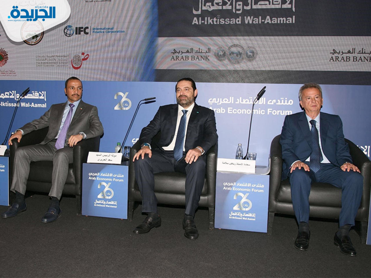 وأشار الى هذه التحديات والمصاعب بالقول انها "تطرح علينا دولا ومجتمعات وهيئات اقتصادية مسؤولية التعاون على إنتاج الأطر المشتركة للتفكير في إعداد الحلول ورسم السياسيات القادرة على تطوير وحماية وتفعيل الاقتصاد العربي لاسيما وان المنطقة العربية تحتاج الى 27 مليون فرصة عمل جديدة في السنوات الخمس المقبلة".واعتبر الحريري ان التحدي الأول الذي يواجه البلدان العربية يكمن في رفع معدلات النمو فيما يكمن التحدي الثاني بجعل هذا النمو نموا مستداما يشمل مختلف قطاعات المجتمع خصوصا النساء والشباب.واكد ان التحدي الثالث هو تنويع مصادر النمو معتبرا ان هذا التنويع لا ينطبق على الدول المصدرة للنفط فقط بل هو ينطبق أيضا على دول كلبنان والأردن ومصر وغيرها من دول المنطقة العربية. وقال ان التجارب اكدت ان تنويع مصادر النمو امر ضروري لتحصين الاقتصادات الوطنية في مواجهة الازمات سواء كانت داخلية أو خارجية وان هذا التنويع يتطلب تأمين بنية تحتية عصرية تسمح بتطوير القطاعات الإنتاجية التقليدية ورفع مستوى إنتاجيتها.وراى ان لبنان وضع خريطة طريق واضحة لرفع معدلات النمو وتنويع مصادره وتأمين استدامته وقد عرضتها الحكومة اللبنانية في مؤتمر (سيدر) في باريس في ابريل الماضي وهي تقوم على أربعة محاور أساسية مكملة لبعضها البعض الأول منها تنفيذ برنامج الإنفاق الاستثماري بقيمة 17 مليار دولار يمتد ل 10 سنوات لتحديث وتطوير البنية التحتية والثاني المحافظة على الاستقرار المالي من خلال إجراء تصحيح مالي بمعدل واحد بالمئة سنويا على مدى خمس سنوات.واستطرد بالقول ان المحور الثالث هو اجراء الإصلاحات الهيكلية والقطاعية الضرورية لضمان الحوكمة الرشيدة ومكافحة الفساد وتطوير التشريعات التي تحكم عمل القطاع الخاص وتحديث إجراءات القطاع العام بينما يركز المحور الرابع على وضع وتنفيذ استراتيجية لتطوير القطاعات الإنتاجية سواء التقليدية أو الجديدة منها ورفع قدرة وإمكانات لبنان التصديرية.واكد الحريري أهمية الدور الأساس والمهم للقطاع الخاص في تنفيذ خريطة الطريق المشار اليها وان لبنان يعول على قدرات وإمكانات هذا القطاع الذي أثبت جدارته في تطوير العديد من القطاعات وتنفيذ وإدارة العديد من المشاريع.وأشار الى توجه لبنان باشراك القطاع الخاص في إدارة وتنفيذ المشاريع بعد إقرار قانون تنظيم الشراكة بين القطاعين العام والخاص وقد جرى خلال الأشهر القليلة الماضية اطلاق مشاريع شراكة في قطاعي النقل والاتصالات.وقال "نحن امام خيار من اثنين اما الاستسلام للواقع الحالي وللصعوبات التي تواجه لبنان واما النهوض بلبنان لتأمين الازدهار لكل اللبنانيين" معربا عن ثقته بأن المجتمع السياسي اللبناني سيتجاوز مرحلة السجالات السياسية لاجل حياة كريمة لكل اللبنانيين.واكد الحريري ثقته بتغلب العالم العربي على المخاطر مهما اشتدت قائلا "اننا مع البلدان الشقيقة نتوق لمرحلة من الاستقرار وإعادة الإعمار والازدهار والنمو فكلنا شركاء في عملية النهوض بمنطقتنا ومستقبل المنطقة واعد".وكان المنتدى قد كرم رئيس مجلس الامة الكويتي والحريري وشخصيات لبنانية وعربية أخرى.ويمتاز منتدى هذا العام بحضور وفد كويتي رفيع المستوى يتقدمه رئيس مجلس الأمة مرزوق الغانم ومحافظ بنك الكويت المركزي الدكتور محمد الهاشل ووزير المالية الأسبق بدر الحميضي ومدير عام المؤسسة العربية لضمان الاستثمار وائتمان الصادرات فهد الإبراهيم.