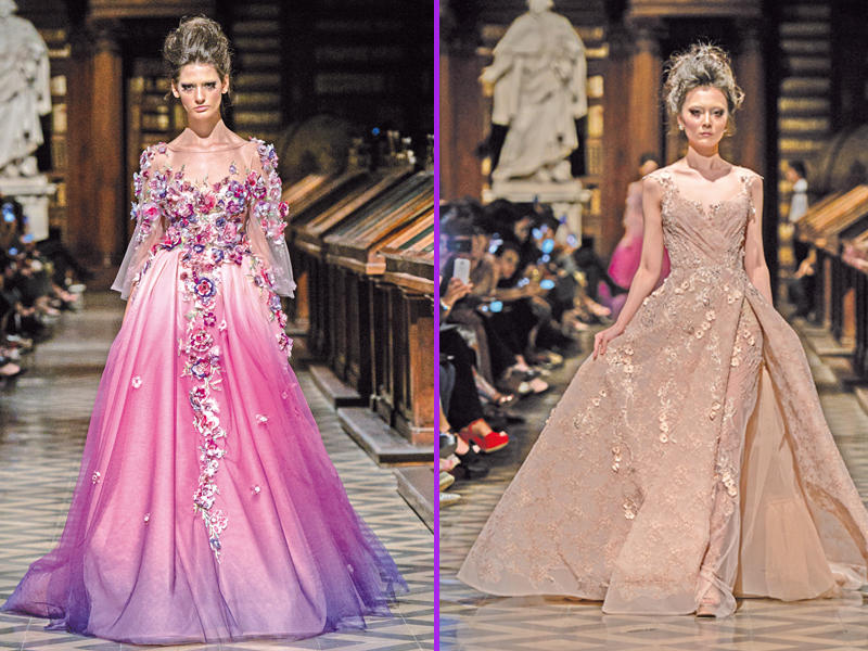 وتوج المصمم عرضه الساحر بفستان زفاف ملوكي زينه تطريز ناعم بأفخم الكريستال وخيوط الحرير المرصعة بالأحجار الكريمة، وامتزجت فيه ثلاثة ألوان وثلاثة أنواع من الأقمشة لتشكل لوناً جديداً من الزهري والـ«أوف وايت»