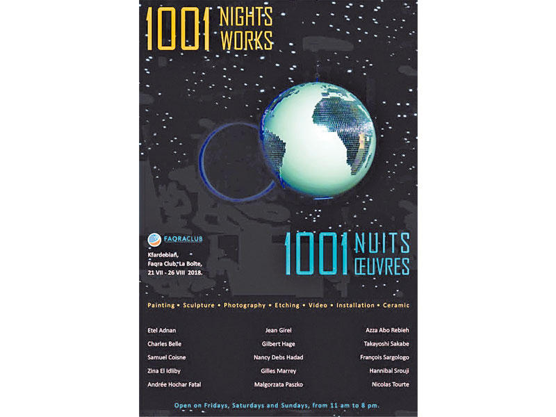 تنظم «غاليري أليس مغبغب» معرض «ألف ليلة وليلة، ألف عمل وعمل» في منطقة فقرا في أعالي جبل لبنان (21 يوليو- 26 أغسطس 2018)، ويتمحور حول الليل رمز الوحشة، والسكينة، والتمزق، والحلم، والانبهار، والسماوات المفروشة بالنجوم، ذلك من خلال رسوم، ومنحوتات، وصور فوتوغرافية، وأعمال مطبوعة على الخشب، وأعمال خزفية معاصرة، إضافة إلى عروض موسيقية وأفلام وثائقية حول الرسم والسينما والموسيقى والرقص والطرب الشرقي والأوبرا. يشارك في المعرض 14 فناناً من لبنان وسورية وأوروبا واليابان.