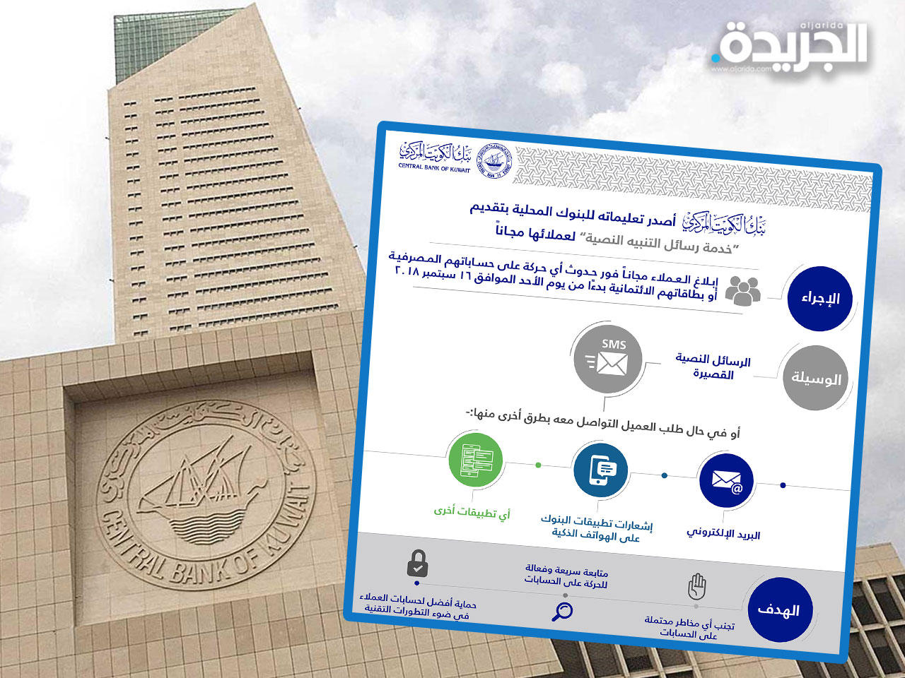 اصدر بنك الكويت المركزي اليوم الاربعاء تعليمات إلى جميع البنوك الكويتية وفروع البنوك الأجنبية العاملة في الكويت بتوفير خدمة الرسائل النصية مجانا للعملاء الأفراد عن كل معاملاتهم المصرفية.وقال محافظ البنك المركزي الدكتور محمد الهاشل في بيان لوكالة الانباء الكويتية (كونا) ان من ضمن المعاملات المشمولة بخدمة الرسائل عمليات البطاقات المصرفية المختلفة والمعاملات الإلكترونية الأخرى التي يقوم بها العميل إلا في الحالات التي يطلب فيها العميل التواصل معه بطرق أخرى كالبريد الإلكتروني أو الإشعارات التي ترسل عبر تطبيقات الهواتف الذكية.