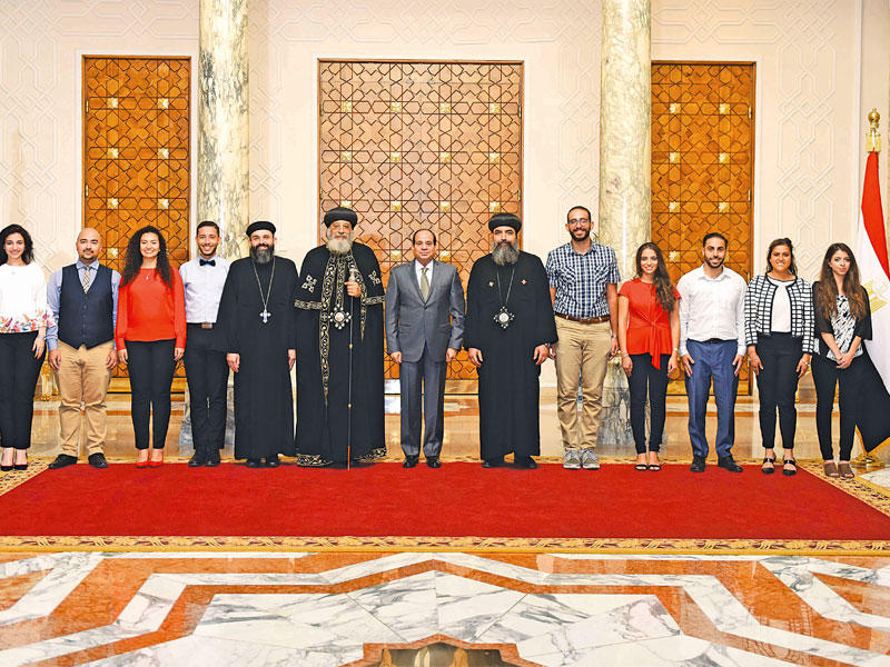 استقبل الرئيس المصري عبدالفتاح السيسي، أمس، البابا تواضروس الثاني بابا الإسكندرية وبطريرك الكرازة المرقسية، مع وفد من ملتقى الشباب العالمي الأول للكنيسة القبطية الأرثوذكسية، الذي يعد الأول من نوعه لشباب الأقباط من جميع أنحاء العالم.وأكد السيسي اعتزاز مصر بالأقباط وفخرها بما يقدمونه من إنجازات ونجاحات في الداخل والخارج، موضحاً أن الوحدة الوطنية ثابتة بمصر على مدار بروابط قوية من الأخوة والمحبة ومنظور وطني من التسامح والشراكة الكاملة بعيداً عن التمييز.كما استقبل السيسي، أمس، نائب رئيس الوزراء ووزير التنمية الاقتصادية الإيطالي لويجي دى مايو، وأبدى ترحيبه بتكثيف الزيارات المتبادلة بين البلدين، باعتبارها دليلاً على عودة العلاقات إلى مسارها الطبيعي.