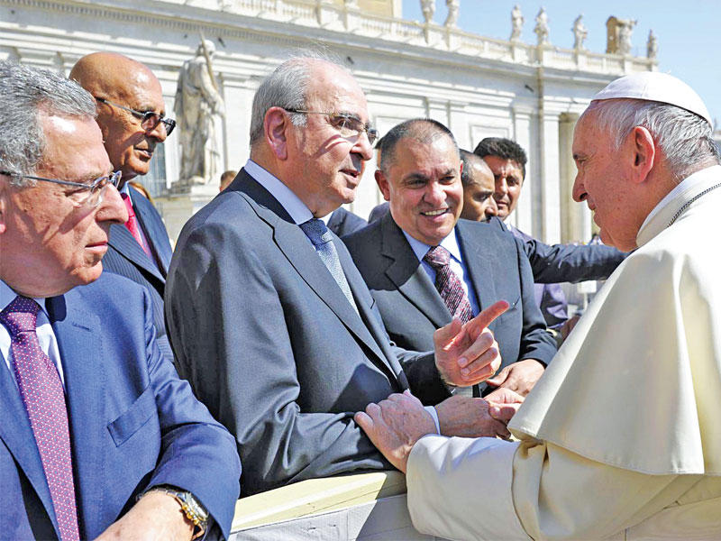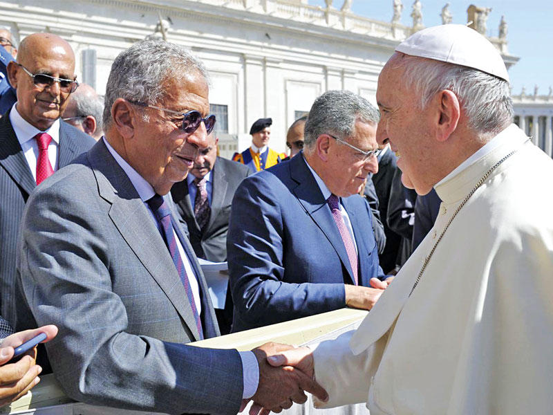 أشاد رئيس مجلس العلاقات العربية والدولية محمد جاسم الصقر بالمبادرات المهمة والكثيرة التي قدمها بابا الفاتيكان فرانسيس الأول، وفي مقدمتها تضامنه مع جهود مكافحة الإرهاب من جهة، مع إنكاره نسبة هذه الآفة إلى الإسلام من جهة أخرى، معتبراً أن هذا الأمر يُسهم بشكل إيجابي في مواجهة ظاهرة الإسلاموفوبيا في الغرب.جاء ذلك في كلمة قدمها الصقر أمس الأول، وبرفقته وفد من مجلس العلاقات، يضم إلى جانبه كلاً من رئيس الوزراء الأردني الأسبق طاهر المصري، ورئيس الوزراء اللبناني فؤاد السنيورة، والأمين العام لجامعة الدول العربية السابق عمرو موسى، ورجل الأعمال المهندس نجيب ساويريس، إلى بابا الفاتيكان، بناء على دعوة وجهها قداسته إلى المجلس. وأكد الصقر أن جهود البابا النبيلة والخيّرة ودعوته إلى السلام والعدل والإخاء واجهت انتهاكاً سافراً بإقدام الإدارة الأميركية الحالية على الاعتراف بالقدس عاصمةً لإسرائيل ونقل سفارة واشنطن إليها دون مراعاة للحقوق الوطنية المشروعة للشعب الفلسطيني، مما يزرع بذور الفتن والصراعات السياسية والدينية. وتطرق رئيس المجلس، في كلمته، إلى تعريف البابا بمجلس العلاقات، وفكرته وأهدافه وأعضائه والمحاور التي يعمل عليها، فضلاً عما يقوم به المجلس من اجتماعات واتصالات مع كبار المسؤولين بالدول العربية ودول الجوار لوضع دراسات حول المقاربات الضرورية لمواجهة المشكلات الخطيرة التي تعانيها المنطقة والعالم. ورأى أن المسلمين والمسيحيين بحاجة إلى التفكير الجدّي في المشكلات والتحديات التي تواجه المنطقة، مع مراجعتهم وتجديدهم العقد الاجتماعي الوطني على أسس احترام الحريات العامة وحقوق الإنسان والقيم الرفيعة، والدولة المدنية. وفيما يلي نص الكلمة.