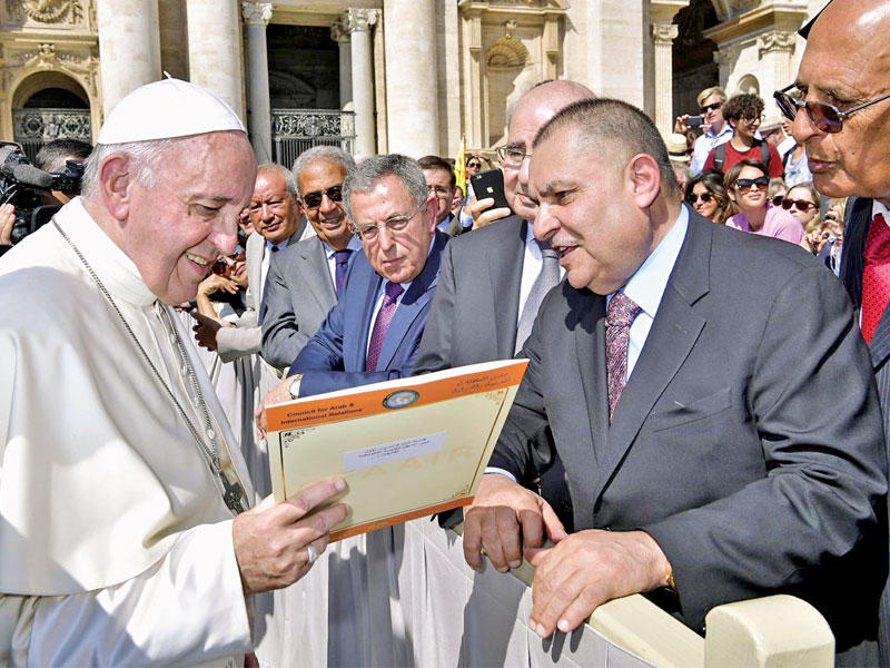خلال لقائه أمس الأول قداسة البابا فرانسيس الأول في الفاتيكان، أكد رئيس مجلس العلاقات العربية والدولية محمد جاسم الصقر أن مدينة القدس الفلسطينية هي مدينة كل الأديان، ليرد البابا بأنها أيضاً «موطن السلام».وفي كلمة باسم وفد مجلس العلاقات للبابا فرانسيس، قال الصقر إن المجلس من خلال متابعته للمسيرة الإنسانية النبيلة للحبر الأعظم للكنيسة الكاثوليكية يرى أن «هناك مشتركات كثيرة بيننا في الهموم والتطلعات والطموحات»، معرباً عن سروره بدعوة البابا للمجلس إلى الحوار والتشاور في المسائل ذات النفع العام للمنطقة العربية ولقضايا السلام والعدالة في العالم.وأكد أن المسلمين والمسيحيين في الشرق الأوسط يشعرون بالحاجة إلى التفكير الجدّي في المشكلات والتحديات التي تواجه منطقتهم، وتجديد العقد الاجتماعي الوطني على أسس احترام الحريات العامة وحقوق الإنسان، معتبراً أن الوجود المسيحي العريق في المنطقة العربية، والعيش المشترك مع المسلمين، هما بحدّ ذاتهما رسالة.ورأى أن مبادرات الدعوة إلى العيش المشترك في منطقة كالشرق الأوسط يمكن أن تُسهم في إرساء الحوار والتعاون بين ضفتي «المتوسط»، حتى يصبح بحراً للشراكة الإنسانية والثقافية والتعاون الاقتصادي بدلاً من أن يتحول إلى مستنقعٍ للموت والتهجير.
