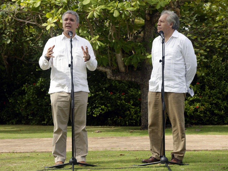 دعا الرئيس الكولومبي إيفان دوكي أعضاء منظمة الدول الأميركية «OAS»، لدعم بلاده، في طلب قدمته إلى المحكمة الجنائية الدولية ضد الحكومة الفنزويلية، لارتكابها «جرائم ضد الإنسانية»، أمس.جاء ذلك في تصريح صحافي أدلى به دوكي، عقب اجتماع مع الأمين العام للمنظمة لويس ألماغرو، في مدينة كارتاخينا شمالي كولومبيا.