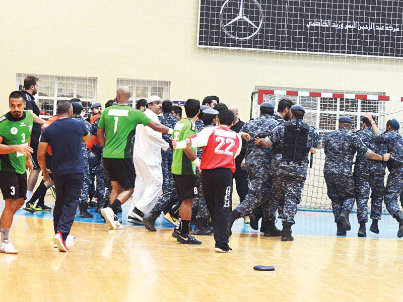 أحداث مؤسفة وغريبة على الرياضة الكويتية، إذ اعتدى عدد من اللاعبين على رجال الأمن، ووصل الأمر إلى تسجيل قضايا في المخفر، هذا ما آلت إليه الأمور داخل صالة مركز الشهيد فهد الاحمد بالدعية، خلال المباراة التي جرت أمس الأول بين العربي وكاظمة، ضمن الجولة الرابعة من الدوري العام لكرة اليد، والتي انتهت بفوز الأخير بنتيجة 20-19(الشوط الاول 11-9)، لينفرد البرتقالي بصدارة الترتيب برصيد 8 نقاط، في حين تجمد العربي عند 6 نقاط، وتراجع للمركز الخامس.