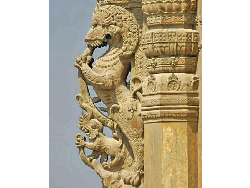 اللافت في تصميم القصر أن فيه برجاً يدور على قاعدة متحركة دورة كاملة كل ساعة، ليتيح للجالس مشاهدة ما حوله في الاتجاهات كافة. والقصر مكون من طابقين وملحق صغير بالقرب منه تعلوه قبة كبيرة، وعلى جدران القصر تماثيل مرمرية لراقصات هنديات وأفيال لرفع النوافذ المرصعة بقطع من الزجاج البلجيكي وفرسان يحملون السيوف وحيوانات أسطورية متكئة على الجدران.