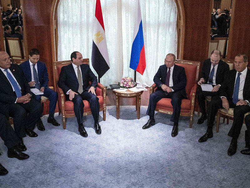 وأضاف السيسي أن المباحثات تطرقت للوضع في سورية، حيث «اتفقنا على العمل على تفادي المزيد من التصعيد الميداني في سورية، بالتوازي مع بحث سبل دعم الحل السياسي، وذلك من خلال تشجيع المبعوث الأممي على إطلاق عمل لجنة صياغة الدستور في أقرب فرصة، كخطوة مهمة، لتهيئة الظروف المناسبة لاستئناف المفاوضات السياسية، وصولا إلى حل سياسي شامل، يحقق الطموحات المشروعة للشعب السوري الشقيق، ويحافظ على وحدة الدولة السورية وسلامتها الإقليمية». وأعلن بوتين أنه تم الاتفاق على تبادل المعلومات في مجال مكافحة الإرهاب فيما يتعلق بانتقال الإرهابيين، وتطرقت المناقشات للأوضاع في سورية وليبيا والقضية الفلسطينية.وأضاف أن المباحثات شملت أيضا العلاقات الاقتصادية، موضحا أن هناك تطورا فى هذا الإطار، حيث ارتفعت نسبة معدل التبادل التجارى حتى منتصف 2018 بنسبة 20 في المئة. وتعهد بوتين بضخ 7 مليارات دولار كاستثمارات في المنطقة الصناعية بشرق بورسعيد، وقال إن الرحلات الجوية الروسية ستعود إلى الغردقة وشرم الشيخ في أقرب وقت. وأضاف أنه اتفق مع الرئيس السيسي بشأن العديد من القضايا، مشيرا إلى توقيع الشراكة الاستراتيجية الشاملة مع مصر. وقال: إن حجم التبادل التجاري زاد بشكل ملحوظ خلال العام الماضي، وأضاف: «نأمل أن تفتح أسواقا جديدة مع مصر».وأشار بوتين إلى توقيع عدد من الاتفاقيات الضخمة مع مصر، وخاصة في مجال النقل وشراء عربات قطارات.7 مليارات دولار