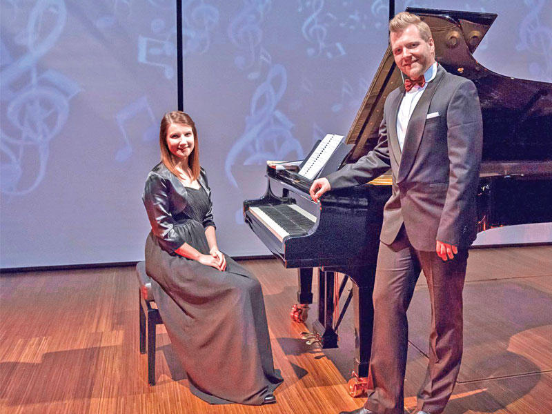 ثم انتقل الثنائي إلى العزف المشترك على آلة بيانو واحدة، في "الرقصات الهنغارية" (1، 2، 5) للمؤلف الموسيقي وعازف البيانو يوهانس برامز (1833 - 1897) من أصحاب المدرسة الرومنتيكية.وأنهى الثنائي برنامج الأمسية بعزف مقطوعات من "كسارة البندق"، وهي "افتتاحيات" و"الرقصة الروسية" و"الرقصات المميزة" و"الرقصة العربية" و"الرقصة الصينية" و"رقصة لعبة المزامير" و"رقصة فالس الزهور" و"رقصة جنية البرقوق" للمؤلف الموسيقي الروسي بيوتر تشايكوفسكي (1840 – 1893)، الذي يعد بطل تطور الموسيقى الروسية الحديثة، فهو صاحب 76 مقطوعة موسيقية و10 أوبرات و3 باليهات و7 سيمفونيات وعشرات مقطوعات الكونشرتو للبيانو والفيولونسيل والوتريات. ولا تزال باليهات "بحيرة البجع" و"الحسناء النائمة" و"كسارة البندق" تصنف من كنوز الثقافة الموسيقية العالمية. ولا تزال هذه الأعمال الثلاثة تصدح على خشبة مسرح البولشوي في موسكو وغيره من المسارح العالمية.يشار إلى أن كجيغورج نوفاك عازف بيانو كلاسيكي، بدأ بتعلم العزف على آلة البيانو في سن السابعة، فاز بالعديد من الجوائز في المسابقات الوطنية والدولية، وأقام حفلات موسيقية في بولندا وألمانيا وروسيا وإيطاليا وفنلندا.أما آنا فيلغوس فولدت في كراكوف، وبدأت العزف على البيانو في السادسة من عمرهان وشاركت في العديد من دورات التدريب الدولية الخاصة بقيادة أعظم الموسيقيين في العالم.