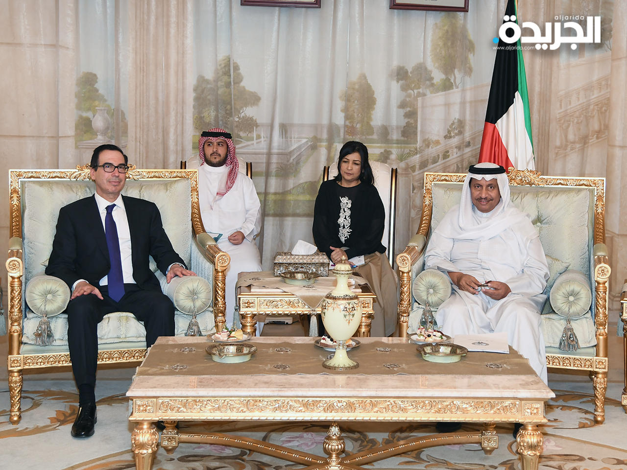 استقبل سمو الشيخ جابر المبارك الحمد الصباح رئيس مجلس الوزراء اليوم معالي وزير الخزانة الأمريكي ستيفن منوشن والوفد المرافق له وذلك بمناسبة زيارته للبلاد.حضر المقابلة معالي نائب رئيس مجلس الوزراء ووزير الخارجية الشيخ صباح الخالد الحمد الصباح ومعالي نائب رئيس مجلس الوزراء ووزير الداخلية الشيخ خالد الجراح الصباح ومعالي وزير المالية الدكتور نايف فلاح الحجرف ومساعد وزير الخارجية لشؤون التنمية والتعاون الدولي ناصر صبيح الصبيح.