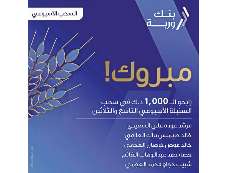 أعلن بنك وربة سحب السنبلة الـ39 في الحادية عشرة ظهر الخميس؛ وقد تم الإعلان عن الفائزين الخمسة بحضور ممثل عن وزارة التجارة والصناعة وموظفي بنك وربة.وحصل العملاء الذين حالفهم الحظ خلال السحب على 1000 دينار لكل منهم، وهم: مرشد عودة علي السعيدي، خالد حريميس براك العازمي، خالد عوض خرصان العجمي، حصة حمد عبدالوهاب الغانم، شبيب حجاج محمد العجمي.