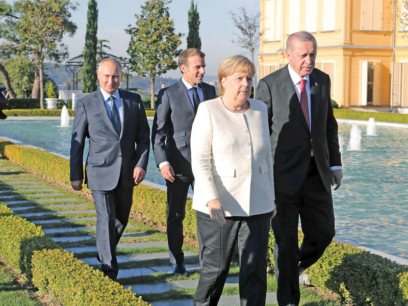 عقدت أمس في إسطنبول قمة رباعية حول سورية، بين روسيا وتركيا وفرنسا وألمانيا، ناقشت بشكل أساسي خريطة طريق محتملة للمضي نحو حل سياسي للأزمة السورية المستمرة منذ عام 2011.وفي بداية الاجتماع، قال الرئيس التركي رجب طيب إردوغان لنظيريه الروسي فلاديمير بوتين، والفرنسي إيمانويل ماكرون، والمستشارة الألمانية أنجيلا ميركل، إن "عيون سورية والعالم مركزة علينا اليوم".