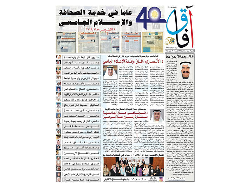 أصدرت جريدة "آفاق"، التي تصدر عن جامعة الكويت، عددا خاصا بمناسبة الذكرى السنوية الأربعين لها، حيث صدر العدد الأول في 28 أكتوبر 1978.وتصدر العدد، الذي حمل الرقم 1141، تهنئة لمدير الجامعة د. حسين الأنصاري، أكد فيها أن "آفاق" سجل يوثق لمسيرة الجامعة، ووصفها بأنها رائدة الإعلام الجامعي.ووصف الأمين العام للجامعة د. مثنى الرفاعي، في الصفحة الأولى، "آفاق" بأنها "منارة وصرح إعلامي مميز".من جهته، استعرض رئيس تحرير "آفاق" د. بدر الحجي، في افتتاحية العدد، مسيرة "آفاق" الجامعية، مبينا أنها حرصت مع أول إطلالة لها على المجتمع الطلابي والجامعي على أن ترسم خطها السياسي العام في العمل الصحافي والإعلامي، انطلاقا من الأهداف العامة لجامعة الكويت.