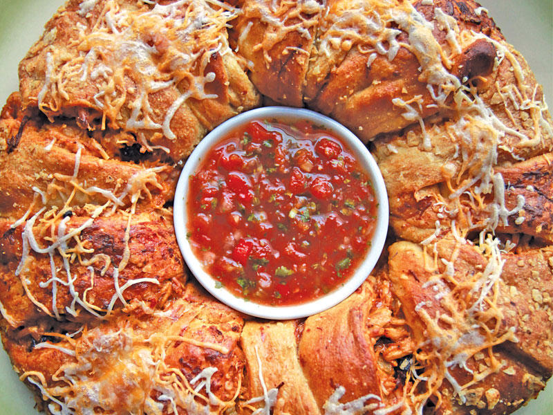 • سخّني الفرن مسبقاً على حرارة 190 درجة مئوية.• في وعاء متوسط، اخلطي الدجاج مع الزيتون وكوب وربع من الجبنة والفلفل الأخضر الحار والمايونيز ومسحوق الفلفل الحار ومسحوق الثوم والكمون والملح والفلفل الأسود وعصير الليمون الأخضر وربع كوب من الصلصة. ضعي ملعقتين كبيرتين من رقائق التورتيلا المسحوقة جانباً واخلطي الكمية المتبقية مع خليط الدجاج.• وزّعي ورق البرشمان في صينية أو جهّزي حجر الخَبز.• رشّي الرقائق المحفوظة على لوح تقطيع كبير. افتحي لفائف الكروسان ولا تفصليها. ضعي العجينة فوقها واضغطيها كي تلتصق بالعجينة.• افصلي العجينة إلى مثلثات ثم وزعيها في الصينية أو على حجر الخَبز ووجّهي جهة الرقائق نحو الأسفل بشكل دائري. يُفترض أن تتداخل الأطراف العريضة في الوسط وتتجه الرؤوس نحو الخارج. يجب أن تبقى فتحة بحجم 5 إنشات في الوسط.• اسكبي خليط الدجاج فوق الأطراف العريضة واتركي مساحة ربع إنش بدءاً من الفتحة. أغلقي رؤوس المثلثات فوق الحشوة وأدخليها تحت الأطراف العريضة. لا تغطّي الحشوة بالكامل. يجب أن يظهر جزء منها بين المثلثات.• اخبزي قطع الإنشيلادا بين 20 و25 دقيقة أو إلى أن تتحمّر. ادهنيها بزيت الكانولا ورشّي عليها ربع كوب من الجبنة في آخر 5 دقائق من مدة الخَبز، ثم أخرجيها من الفرن واتركيها جانباً لبضع دقائق قبل تقطيعها.• قدّميها مع ¾ كوب من الصلصة ومع الكريما الحامضة إذا أردتِ.في الحصة: 221 سعرة حرارية (42 % من الدهون)، 4 غرامات من الدهون (غرام من الدهون المشبعة)، 18 غراماً من الكربوهيدرات، 15 غراماً من البروتينات، 584 ملغ من الصوديوم، 36 ملغ من الكولسترول، غرام من الألياف.شرائح لحم مع الفطر وصلصة البيستو