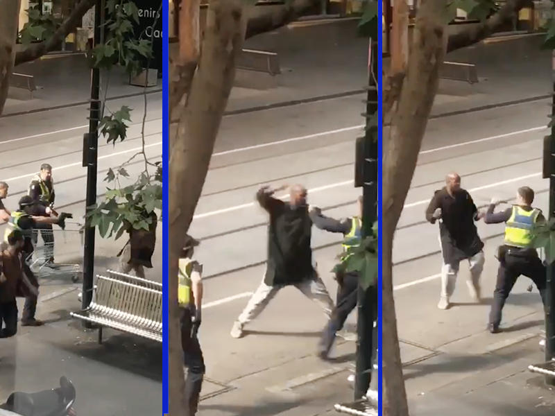 وفق لقطات من تسجيلات فيديو صورها شهود، يظهر رجال شرطة وهم يحاولون توقيف المهاجم من دون استخدام العنف لأقل من دقيقة، بينما يجري نحوهم وهو يرفع سكينه محاولاً الهجوم عليهم.ويقوم الرجل الجسيم بالتلويح بسكينه عشوائياً قرب شاحنته البيك-أب، وهي تحترق في الجوار.وحاول اثنان من المارة مساعدة رجال الشرطة، فتسلح أحدهما بكرسي مقهى، بينما حاول الثاني صدم المشتبه فيه مرات عدة بعربة تسوق معدنية فارغة. ووصف على الفور على مواقع التواصل الاجتماعي بـ"البطل الأسترالي".لكن الهجوم استمر، وبعد لحظات استخدم شرطي سلاحه وأطلق النار على صدر الإرهابي.