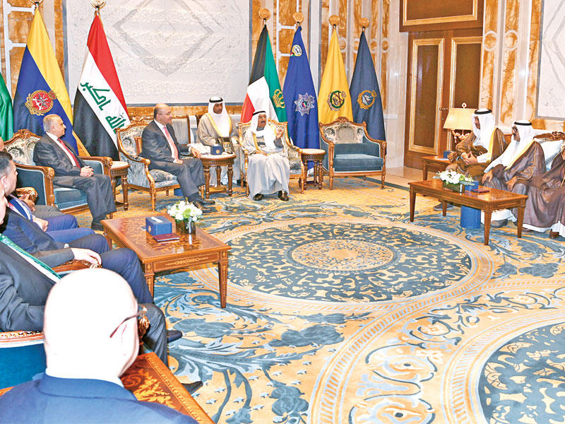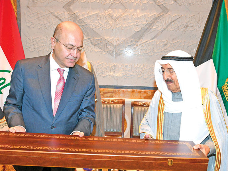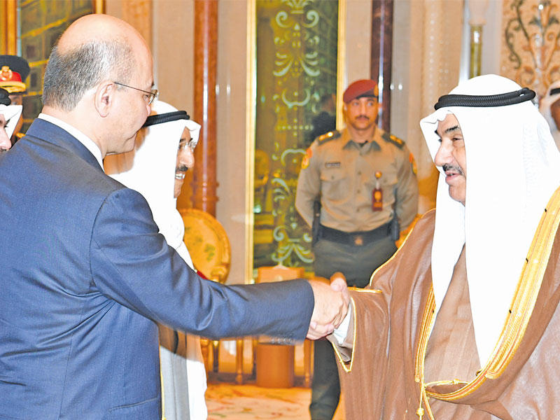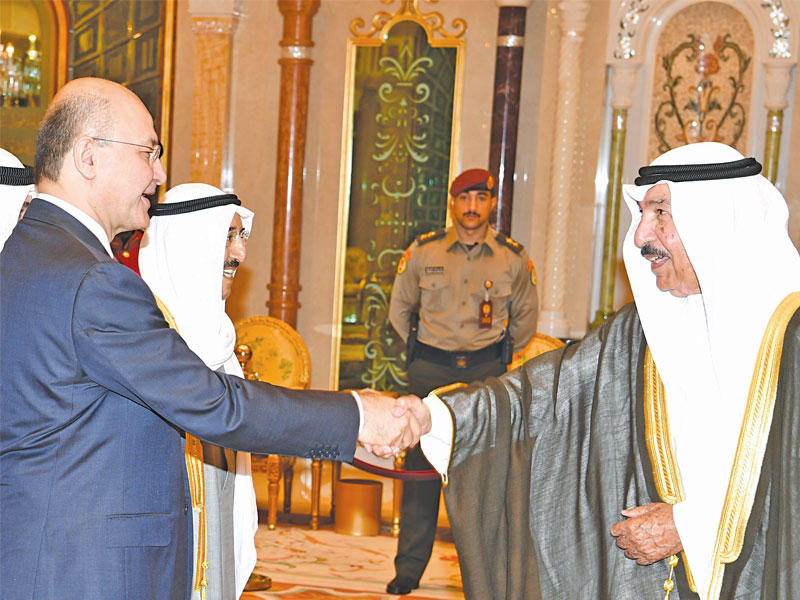 استقبل صاحب السمو أمير البلاد الشيخ صباح الأحمد، بقصر بيان، ظهر أمس، الرئيس العراقي الدكتور برهم صالح والوفد الرسمي المرافق له، بمناسبة زيارته الرسمية للبلاد.وعقدت المباحثات الرسمية بين الجانبين، حيث ترأس الجانب الكويتي صاحب السمو، ورئيس مجلس الوزراء سمو الشيخ جابر المبارك، وكبار المسؤولين بالدولة، وعن الجانب العراقي الرئيس صالح، وكبار المسؤولين في الحكومة العراقية.وصرح وزير شؤون الديوان الأميري الشيخ علي الجراح بأن المباحثات تناولت العلاقات الثنائية التي تربط الكويت بالعراق الشقيق وتعزيزها وتنميتها، والسعي المتواصل للارتقاء بأطر التعاون المشترك في مختلف المجالات إلى آفاق أرحب بين البلدين والشعبين الشقيقين، وسبل دعم أمن واستقرار العراق، لتحقيق وحدة وسلامة أراضيه، وتعزيز الجهود المبذولة في مكافحة الإرهاب والقضاء عليه، كما تضمنت المباحثات مناقشة القضايا ذات الاهتمام المشترك، وآخر المستجدات على الساحتين الإقليمية والدولية.