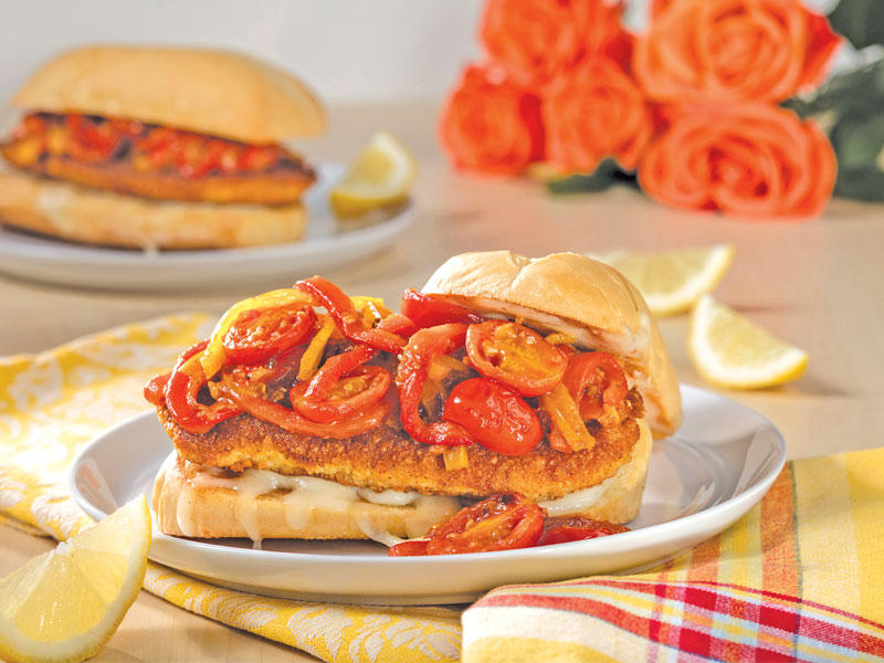 • كوب من مخيض اللبن.• ملح كوشير.• شريحتا دجاج (كل شريحة بوزن 110 غرامات).• 6 ملاعق كبيرة من جبنة البارميزان المبروشة حديثاً.• 6 ملاعق كبيرة من فتات الخبز.• فلفل أسود مطحون حديثاً.• ملعقة كبيرة من زيت الزيتون. • ملعقة كبيرة من الزبدة.• فص ثوم مقطّع.• كوب من الطماطم المقطعة إلى النصف.• كوب من أصابع الفليفلة الصفراء.• ربع كوب من الفلفل الحار (من مرطبان).• ثِمْن ملعقة صغيرة من الفلفل الأحمر المسحوق.• رغيفان من الخبز المسطّح.• ربع كوب من جبنة الموزاريلا المبروشة.الطريقة: