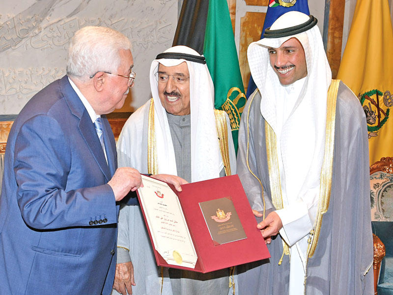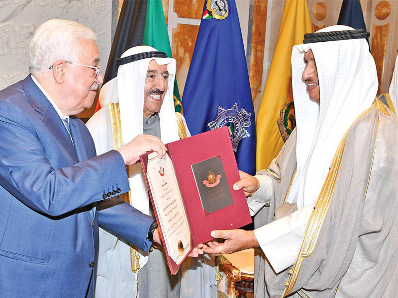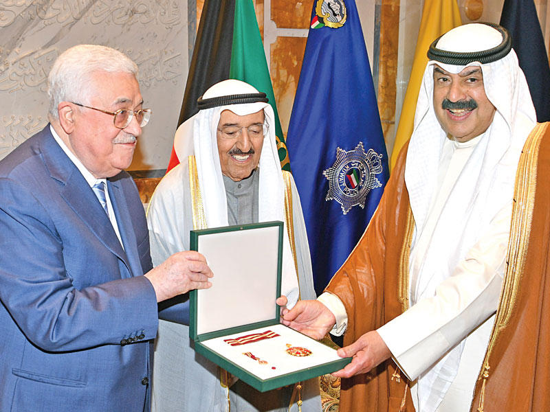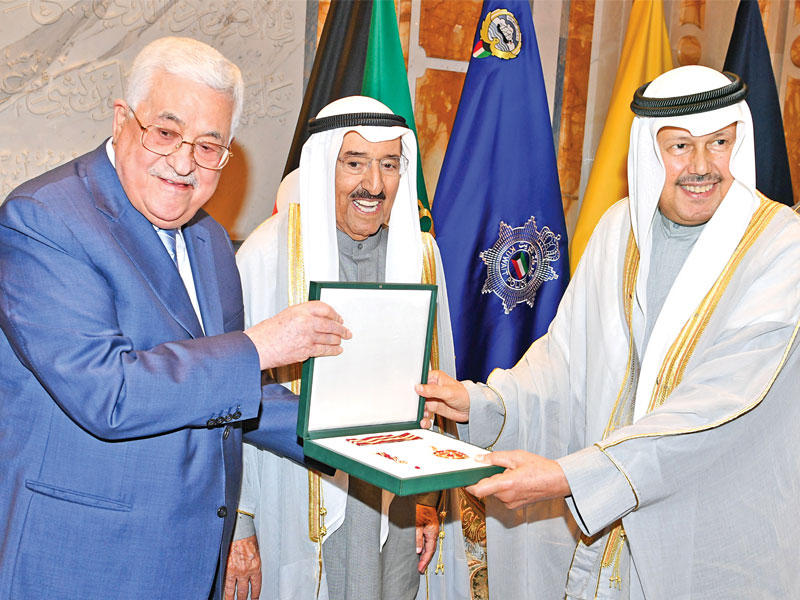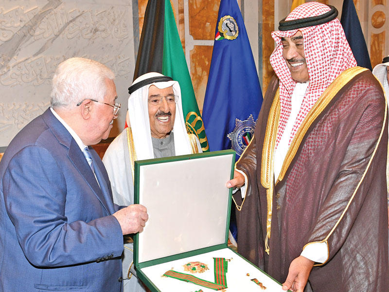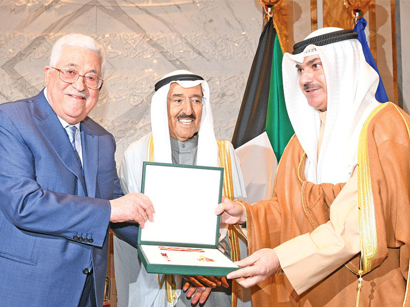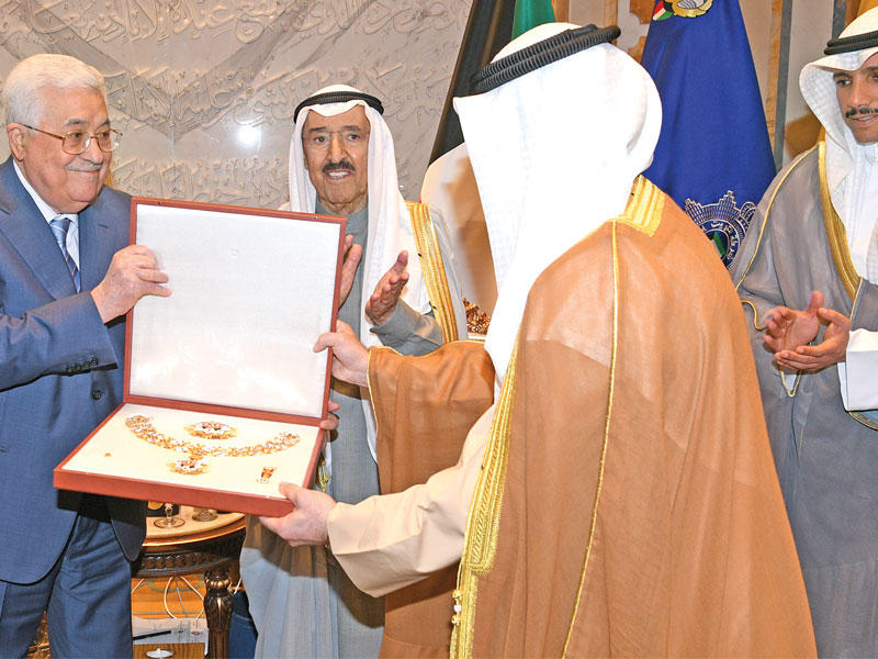 وقام الرئيس الفلسطيني بمنح سمو ولي العهد الشيخ نواف الأحمد قلادة الكنعانيين الكبرى، من وسام الرئيس محمود عباس، كما قام بمنح كل من رئيس مجلس الأمة مرزوق الغانم وسمو رئيس مجلس الوزراء الشيخ جابر المبارك، الوشاح الأكبر لوسام دولة فلسطين.ومنح نائب رئيس مجلس الوزراء وزير الخارجية الشيخ صباح الخالد النجمة الكبرى لوسام نجمة القدس، كما قام بمنح كل من وكيل الديوان الأميري مدير مكتب صاحب السمو أمير البلاد أحمد الفهد، ورئيس المراسم والتشريفات الأميرية الشيخ خالد العبدالله، ونائب وزير الخارجية خالد الجارالله نجمة القدس من وسام القدس. ويرافق عباس وفد رسمي يضم كلا من رئيس هيئة الشؤون المدنية حسين الشيخ ورئيس جهاز المخابرات العامة اللواء ماجد فرج ومستشار الرئيس للشؤون الدبلوماسية مجدي الخالدي وعدد من كبار المسؤولين في حكومة دولة فلسطين.من جانب آخر، استقبل الرئيس الفلسطيني محمود عباس ظهر أمس رئيس مجلس الوزراء سمو الشيخ جابر المبارك، وذلك بمقر إقامته في قصر بيان.حضر المقابلة رئيس بعثة الشرف المرافقة المستشار بالديوان الأميري علي الراشد.وقد استقبل الرئيس الفلسطيني أمس رئيس مجلس الأمة، ثم نائب رئيس مجلس الوزراء وزير الخارجية، قبل أن يغادر البلاد والوفد الرسمي المرافق له، حيث كان في وداعه على أرض المطار وزير شؤون الديوان الأميري.