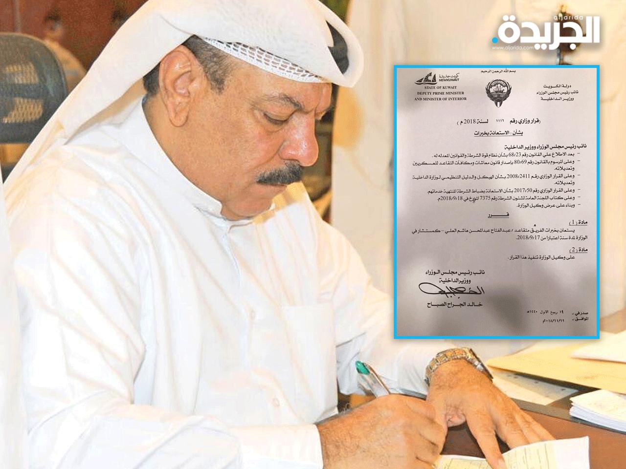 أصدر نائب رئيس مجلس الوزراء ووزير الداخلية الشيخ خالد الجراح قرار وزاري بتعيين الفريق المتقاعد عبدالفتاح العلي مستشاراً في وزارة الداخلية لمدة عام.وجاء القرار الوزراي بتعيين العلي مستشاراً وفق القوانين والنظم الوزارية التي تتيح المجال بالإستعانة من الخبرات العسكرية المتقاعدة والمنتهية خدمتهم.