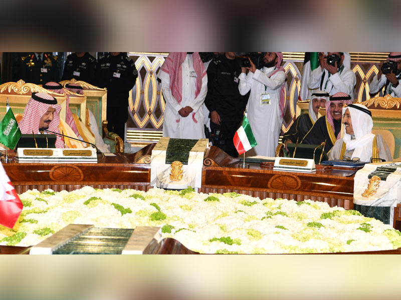 ولفت سموه إلى أن استمرار الصراع في اليمن «يشكل تهديداً مباشراً لنا جميعاً»، آملاً كل التوفيق للمشاورات السياسية الدائرة في السويد، والتي استجابت الكويت لدعمها لوجستياً، وصولاً إلى الحل السياسي المنشود القائم على المبادرة الخليجية وآلياتها التنفيذية ومخرجات الحوار الوطني وقرار مجلس الأمن 2216.وفي الشأن العراقي، هنأ سموه «الأشقاء في العراق على التطورات الإيجابية التي تحققت لهم باستكمال العملية السياسية باختيار القيادات الثلاث»، معرباً عن تطلعه أن يتمكن العراقيون من إعادة البناء وتحقيق الأمن والاستقرار والازدهار في بلادهم.ومن جانبه، اتهم خادم الحرمين الشريفين الملك سلمان بن عبدالعزيز، في كلمته بالقمة، النظام الإيراني بمواصلة سياساته العدائية في رعاية القوى المتطرفة والإرهابية والتدخل في الشؤون الداخلية للدول الأخرى، مبيناً أن «القوى المتطرفة والإرهابية لا تزال تهدد أمننا الخليجي والعربي المشترك»، ولذا بات من الضروري تحقيق الضمانات الكاملة والكافية تجاه برامج طهران النووية والصاروخية.وقال الملك سلمان إن استضافة المملكة هذه القمة تأتي استجابة لرغبة السلطان قابوس بن سعيد، سلطان عمان، و«أطيب التمنيات للسلطنة الشقيقة بالتوفيق والسداد في رئاسة أعمال مجلس التعاون في دورته الحالية»، مؤكداً استمرار السعودية في الدفاع عن القضايا العربية والإسلامية في المحافل الدولية.وأكد أن القضية الفلسطينية تأتي في طليعة القضايا التي تهتم بها المملكة، إذ تسعى السعودية إلى حصول الشعب الفلسطيني على حقوقه المشروعة، بما في ذلك إقامة دولته المستقلة وعاصمتها القدس الشرقية.