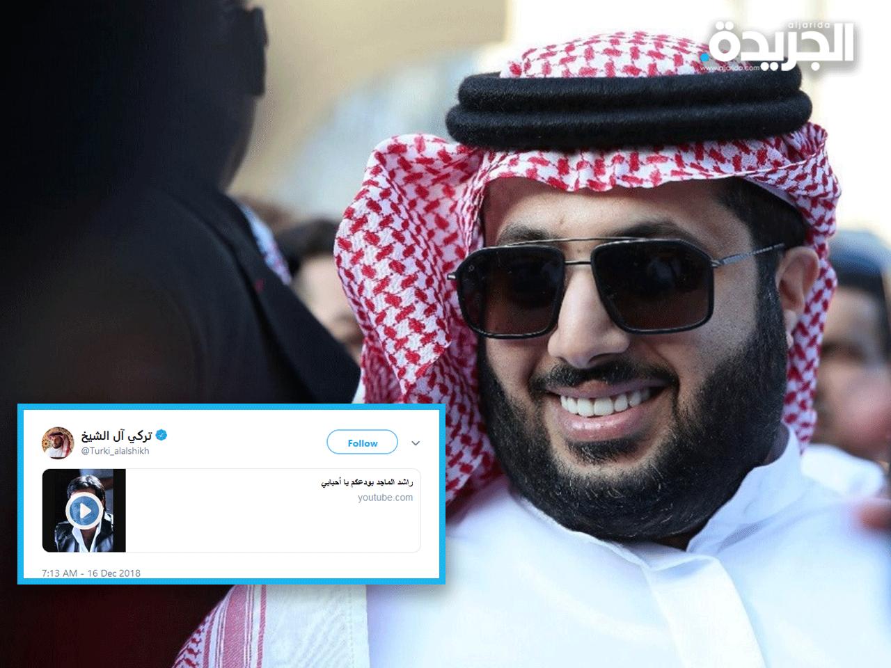 فاجأ رئيس هيئة الرياضة السعودية تركي آل الشيخ متابعيه على شبكة التواصل الاجتماعي "تويتر" بنشر مقطع أغنية للفنان راشد الماجد "بودعكم يا أحبابي".وحظيت التغريدة بتفاعل واسع، حيث قال أحد المغردين "راح نفتقدك"، وقال "آخر "ايش الموضوع، الله يحفظك لتكمل نجاح المشروع الرياضي الذي اضحى واضح للملأ".