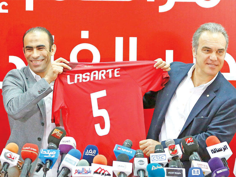أعلن النادي الأهلي، في مؤتمر صحافي أمس، تعاقده رسميا مع الأوروغوياني مارتين لاسارتي لتولي منصب المدير الفني لفريق الكرة الأول خلال الفترة المقبلة، ليكون خلفا للفرنسي باتريس كارتيرون الذي أقيل من منصبه في الشهر الماضي عقب الإخفاق العربي والإفريقي أيضا.وأبدى لاسارتي سعادته بالعمل مع القلعة الحمراء، مضيفا أنه كان يحتاج إلى مثل هذه الفرصة والعمل في إفريقيا، واختار الأهلي لأنه ناد كبير والأكثر تتويجا في البطولات الإفريقية، وتاريخه عظيم وأهدافه كبيرة.وقال لاسارتي إنه يؤمن بمصطلح الانتماء، مشيرا إلى أنه حرص على الإبقاء على ثنائي مصري في الجهاز الفني لإيمانه بذلك، مؤكدا أنه لم يضع شروطاً أثناء التفاوض مع الأهلي.