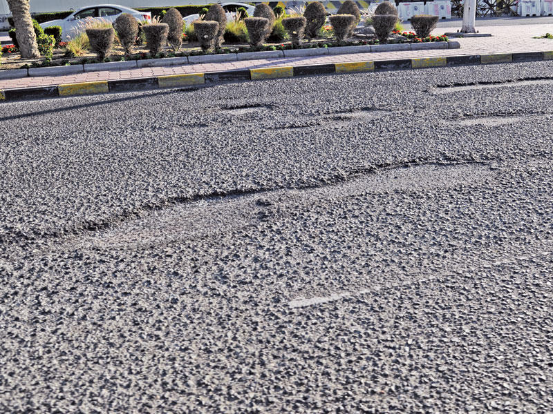 3. استخدام الرمل الطبيعى كأحد مكونات الخلطة الأسفلتية، رغم أنه يتكون من حبيبات دائرية لا تسمح بتماسك البيتومين نهائيا، كما أنه يحتفظ بالرطوبة داخل حبيباته ولا يستطيع المحمص تجفيفها بالكامل.4. عدم استخدام الطرق الحديثة لتصميم الخلطات الأسفلتية بما يتلاءم مع الأحوال الجوية في الكويت.