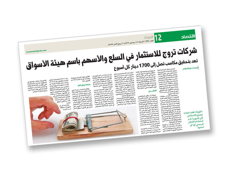 تفاعلا مع ما نشرته «الجريدة»، في عددها الصادر 12 ديسمبر الماضي، عن شركات وحسابات في موقع تويتر تروج للاستثمار في سلع الذهب والنفط والعملات والأسهم، مدعية أنها مرخصة من هيئة أسواق المال، أعلنت الهيئة أمس تقديم بلاغ لنيابة سوق المال عن شبهة وقوع الجريمة المنصوص عليها في المادة 125 من القانون 7 لسنة 2010 وتعديلاته، لقيام المبلغ ضده من خلال «تويتر» في 5/12/2018 بنشر تغريدة مدعيا بها، على خلاف الواقع، أنه مرخص من قبل الهيئة، كما قام في تواريخ لاحقة بنشر عدة تغريدات في ذات النطاق، ثم حذفها، على نحو يؤكد مخالفة أحكام المادة 125 سالفة الذكر.كما قدمت «هيئة الأسواق» بلاغا آخر لنيابة سوق المال في 10/01/2019 عن شبهة وقوع الجريمة المنصوص عليها في المادة 125، لقيام المبلَّغ ضده من خلال «تويتر» في 5/12/2018 بنشر تغريدة مدعيا بها على خلاف الواقع أنه مرخص من قبل الهيئة، كما قام ذات الحساب بنشر تغريدة أخرى في 25/12/2018 بذات مضمون التغريدة الأولى على نحو يؤكد مخالفة أحكام المادة 125.