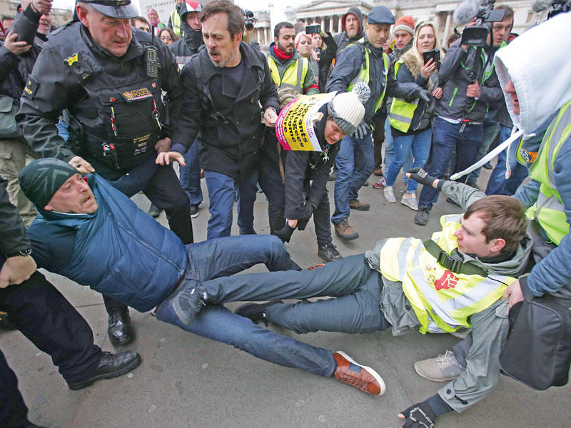 بدوره، ذكر زعيم حزب الديمقراطيين الأحرار، الموالي للاتحاد، فينس كيبل، أمس، أن البرلمان سيتحرك حتى لا تخرج بريطانيا من التكتل دون اتفاق.إلى ذلك، كشفت صحيفة «ذا أوبزرفر»، أمس، أن وزارة الدفاع البريطانية نشرت أكثر من 12 من خبراء التخطيط العسكريين في الوزارات الرئيسية، في إطار استعدادات البلاد للخروج من الاتحاد. وتجمع الآلاف في لندن، أمس الأول، للتظاهر ضد الحكومة، مطالبين بوقف إجراءات التقشف، وإجراء انتخابات عامة جديدة.وتوافد السياسيون وقادة النقابات من مختلف أنحاء البلاد لحضور فعالية «تجمع الشعب ضد التقشف»، التي جذبت نحو 5 إلى 10 آلاف متظاهر، في حين حضر ممثلون عن حركة السترات الصفراء الفرنسية، التي ألهمت التظاهرة البريطانية في لندن.