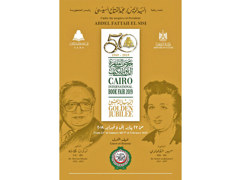 يحمل ملصق معرض القاهرة الدولي للكتاب شعار الدورة الخمسين الذهبية المقرر انطلاقها في 22 يناير الجاري، بأرض المعارض الجديدة بالتجمع الخامس. كذلك يحمل صورتي كل من الدكتور ثروت عكاشة باعتباره أول وزير للثقافة، والدكتورة سهير القلماوي باعتبارها الرئيسة الأولى للمعرض. وتحل جامعة الدول العربية ضيف شرف دورة هذا العام، فيما يستضيف المعرض أكثر من 150 شخصية من كبار المثقفين والمفكرين، وتشارك فيه دول عربية وأجنبية.