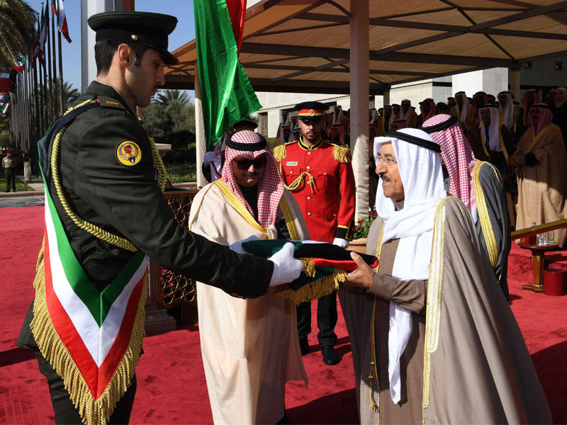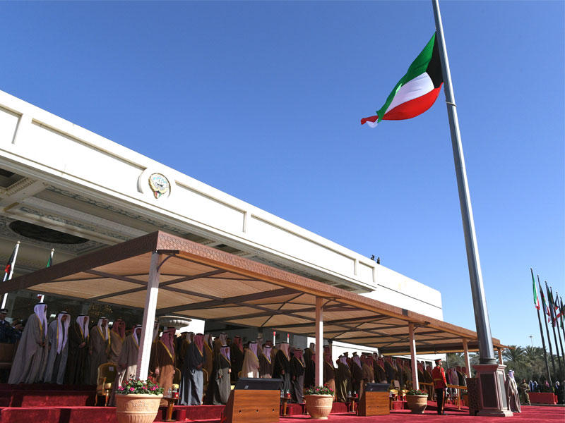 بحضور صاحب السمو أمير البلاد الشيخ صباح الأحمد، احتفل بقصر بيان، صباح أمس، بمراسم رفع العلم، وشهد الحفل سمو ولي العهد الشيخ نواف الأحمد، ورئيس مجلس الأمة مرزوق الغانم، ورئيس مجلس الوزراء سمو الشيخ جابر المبارك وكبار المسؤولين بالدولة.ووصل موكب سموه إلى مكان الحفل، حيث أطلقت المدفعية «21» طلقة ترحيبية بسموه، كما استقبل سموه بكل حفاوة وترحيب من أبنائه منتسبي الجيش والشرطة والحرس الوطني.ثم قام سموه برفع علم الدولة وتم عزف النشيد الوطني، بعدها ألقى الرائد فهد الشمري قصيدة وطنية بهذه المناسبة.وتم إهداء سموه هدية تذكارية بهذه المناسبة من أبنائه منتسبي القوات المسلحة.