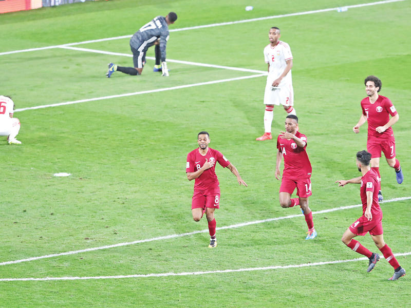 تأهل المنتخب القطري للمرة الأولى في تاريخه إلى نهائي كأس آسيا لكرة القدم، بفوزه الكبير على مضيفه الإماراتي 4 / صفر أمس في المربع الذهبي للبطولة.ويلتقي المنتخب القطري بعد غد الجمعة في المباراة النهائية مع نظيره الياباني الذي فاز في المربع الذهبي على إيران بثلاثة أهداف دون رد.وتقدم بوعلام خوخي بهدف للعنابي القطري في الدقيقة 22، ثم أضاف المعز علي الهدف الثاني في الدقيقة 37، ليعزز صدارته لقائمة هدافي البطولة برصيد ثمانية أهداف.وأكمل حسن الهيدوس ثلاثية الفريق القطري في الدقيقة 80، قبل أن يختتم البديل حامد إسماعيل التسجيل في الوقت بدل الضائع.