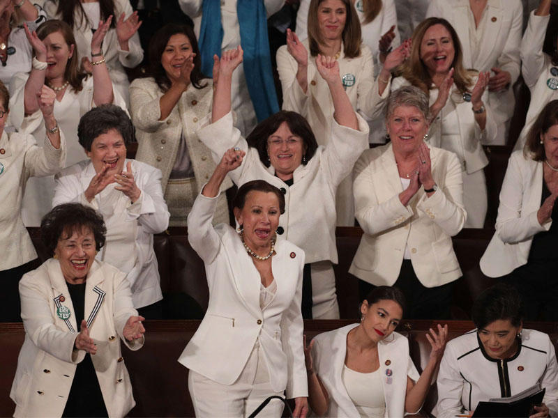 قال الرئيس دونالد ترامب إن هناك عدداً قياسياً من النساء ضمن القوى العاملة، "أكثر من أي وقت مضى"، مشيرا إلى أن عدد النساء في الكونغرس أيضا هو الأكبر على الإطلاق. لم يكن ترامب بحاجة إلا للنظر إلى بحر الملابس البيضاء التي ارتدتها الديمقراطيات الجالسات في مقاعد مجلس النواب.انقسام
