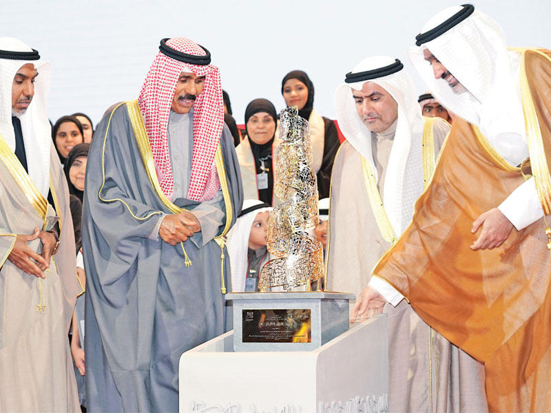 تحت رعاية صاحب السمو أمير البلاد الشيخ صباح الأحمد أقيم أمس، الحفل الختامي لتكريم الفائزين والفائزات في مسابقة الكويت الكبرى لحفظ القرآن الكريم وتجويده الثانية والعشرين وذلك على مسرح قصر بيان.وأناب سموه سمو ولي العهد الشيخ نواف الأحمد لحضور الحفل، إذ استقبل ممثل سموه لدى وصوله إلى مكان الحفل بكل حفاوة وترحيب من وزير الأوقاف والشؤون الإسلامية ووزير الدولة لشؤون البلدية فهد الشعلة، وشهد الحفل رئيس مجلس الأمة مرزوق الغانم ورئيس مجلس الوزراء سمو الشيخ جابر المبارك وكبار المسؤولين بالدولة.وبدأ الحفل بالنشيد الوطني، ثم تلا أحد الفائزين بالمسابقة آيات من الذكر الحكيم، وألقى الوزير الشعلة كلمة بالمناسبة شكر في مستهلها الرعاية السامية للمسابقة التي وصلت عامها الثاني والعشرين وهو انعكاس إيجابي للاهتمام البالغ من سموه بكتاب الله تعالى وحرص سموه على رعايته وتنشئة جيل من أبناء هذا الوطن على خلق القرآن ونهجه.وشكر الشعلة سمو ولي العهد وقال: إن تفضلكم بتمثيل صاحب السمو في رعاية المسابقة وتشريفها بحضوركم لهو توفيق من الله تعالى أجرى به الخير على أيديكم لتكون في مقام القدوة الحسنة في العمل من أجل عزة الإسلام ونصرة المسلمين والتشجيع على الإقبال على كتاب الله لحفظه وتلاوته وتجويده كنماذج طيبة للاقتداء والتأسي بها.
