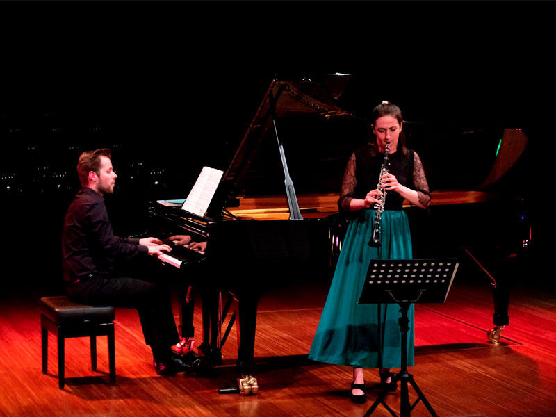 وذكرت كارنر أنها نمساوية من مواليد فيينا، والتقت سكاربيك أثناء دراستها للموسيقى في فيينا. ولفتت إلى أن الأمسية تحتوي على إبداعات مؤلفين موسيقيين من النمسا أو من أوروبا، وخاصة من ألمانيا وفرنسا.وأوضحت أن الكلارينيت التي بحوزتها مختلفة عن بقية الآلات، حيث تصنع فقط في ألمانيا والنمسا، ويستغرق تصنيعها وقتا طويلا، وهي من الخشب، وتمتاز بمفاتيحها.وأهدى عازف البيانو سكاربيك الجمهور مقطوعة "المازوركا"، وهي رقصة بولندية شعبية للمؤلف الموسيقي فريديريك شوبان، مدتها 3 دقائق. كما عزف سوناتا البيانو رقم 22 للمؤلف الألماني روبرت شومان، إذ تمثل مؤلفاته الحالتين النفسيتين المتناقضتين للموسيقى الرومانسية؛ إحداهما عاطفية نابضة، والأخرى هادئة وتأملية.أما كارنر، فقد عزفت الحركة الثانية من كونشيرتو الكلارينيت للمؤلف الموسيقي فولفغانغ موتسارت.