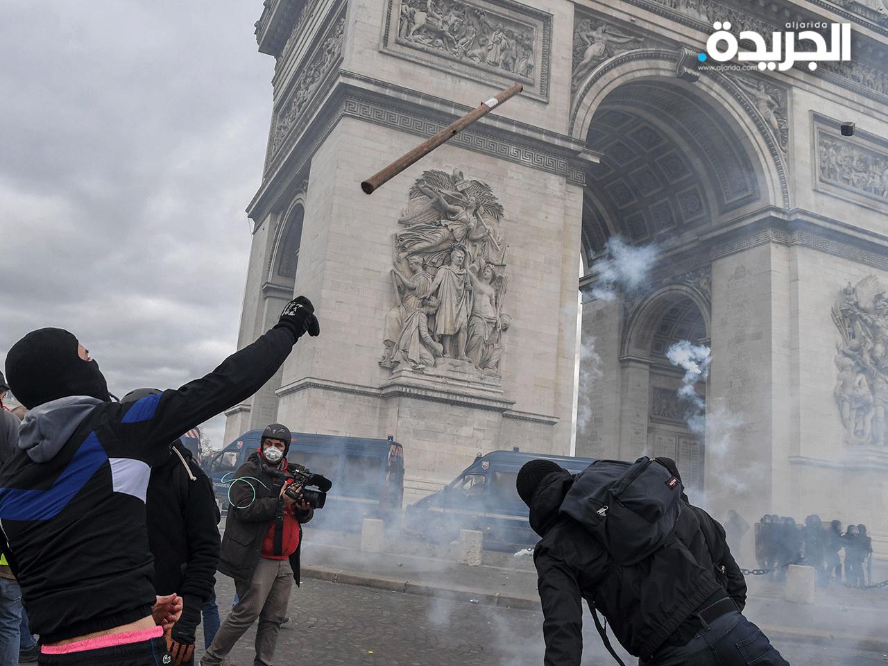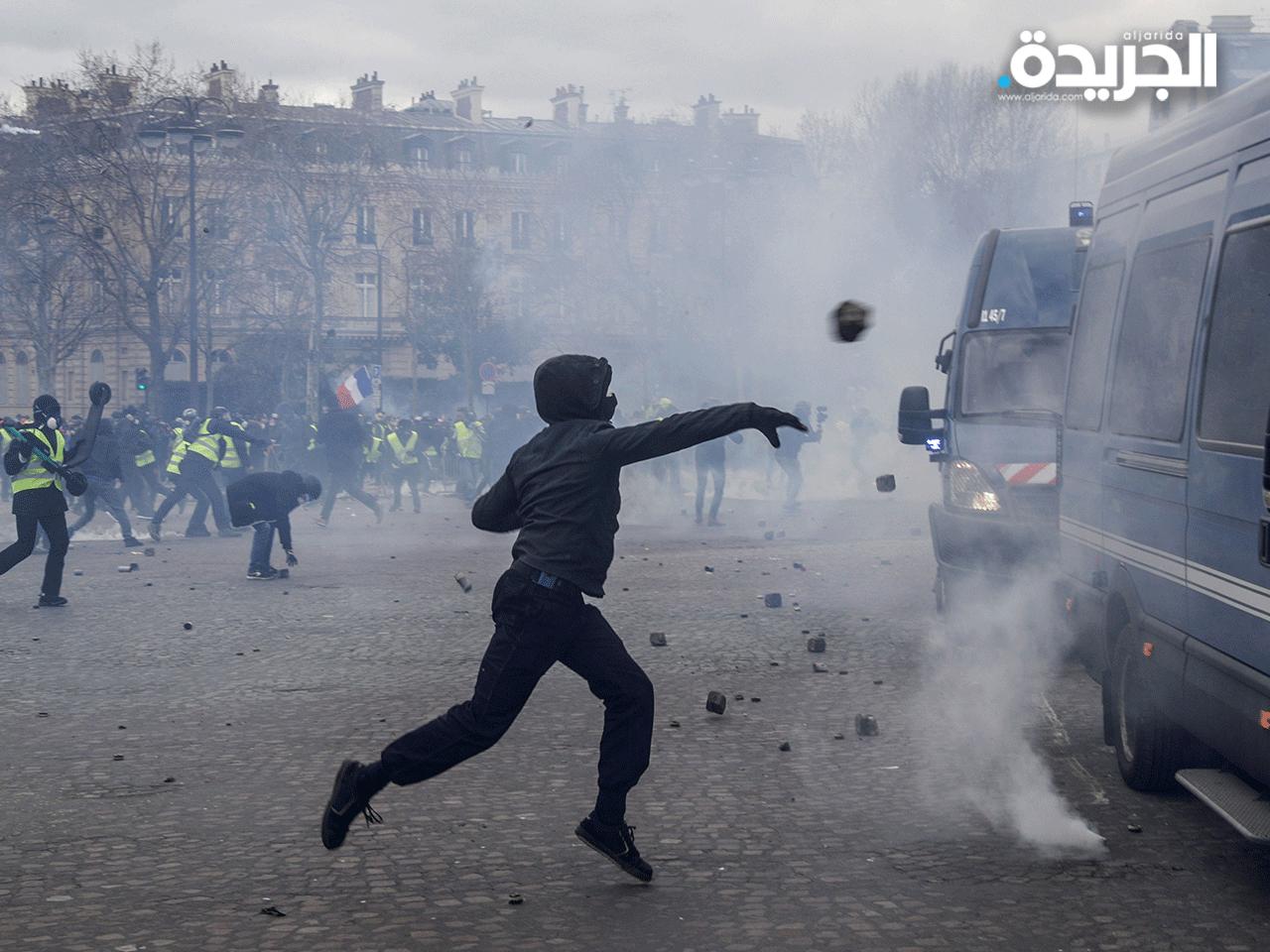 بحسب مشاهد بثها الاعلام حاول محتجون مهاجمة شاحنة للدرك في حين أقام آخرون حواجز على الجادة حيث تجمع آلاف "السترات الصفراء" منذ الصباح.وافادت مراسلة فرانس برس أن قوات الأمن استخدمت الغاز المسيل للدموع وخراطيم المياه لتفريق المتظاهرين. وأوقفت الشرطة 31 شخصا بحسب حصيلة نشرتها في الساعة 10,30 ت غ دائرة شرطة باريس.ووعد مسؤولون عن هذا التحرك ب"تجديد التعبئة" السبت رغبة منهم في إثبات عزيمتهم بعد أربعة أشهر على اطلاقه.وبعد توجيه "مهلة" للحكومة دعوا أنصارهم إلى التجمع في باريس.وقال اريك درويه وهو سائق شاحنة في المنطقة الباريسية "ننتظر أشخاصا من تولوز وبوردو ومارسيليا وروان" مشيرا إلى مناصرين وصلوا من إيطاليا وبلجيكا وهولندا وبولندا.ووعد ماكسيم نيكول المسؤول الآخر في "السترات الصفراء" بيوم "لا ينسى" ب"نهاية أسبوع تعد الأكثر أهمية منذ بدء التحرك".ويأتي هذا اليوم الجديد من التظاهرات بعد نقاشات نظمت في كل أنحاء فرنسا بمبادرة من السلطات. وترغب الحكومة بذلك في ضبط مشاعر الغضب وتقديم مقترحات في حين يشهد عدد المتظاهرين تراجعا مستمرا في الأسابيع الأخيرة.بحسب أرقام الداخلية التي ترفضها الحركة، كان عددهم 28600 في فرنسا السبت الماضي أي أقل ب10 مرات مما كانوا في 17 تشرين الثاني/نوفمبر لدى انطلاق التحرك (282 ألفا).وتفاديا للاضطرابات وأعمال النهب التي تخللت بعض التظاهرات ونقلتها قنوات عالمية، نشرت أعداد كبيرة من قوات الأمن.وتم نشر خمسة آلاف عنصر وست آليات مدرعة للدرك في العاصمة حيث ستنظم تظاهرات أخرى خصوصا "مسيرة القرن" من أجل المناخ.كما أن هناك تظاهرات مرتقبة في بوردو (جنوب غرب) وليون (وسط شرق) ومونبولييه (جنوب).