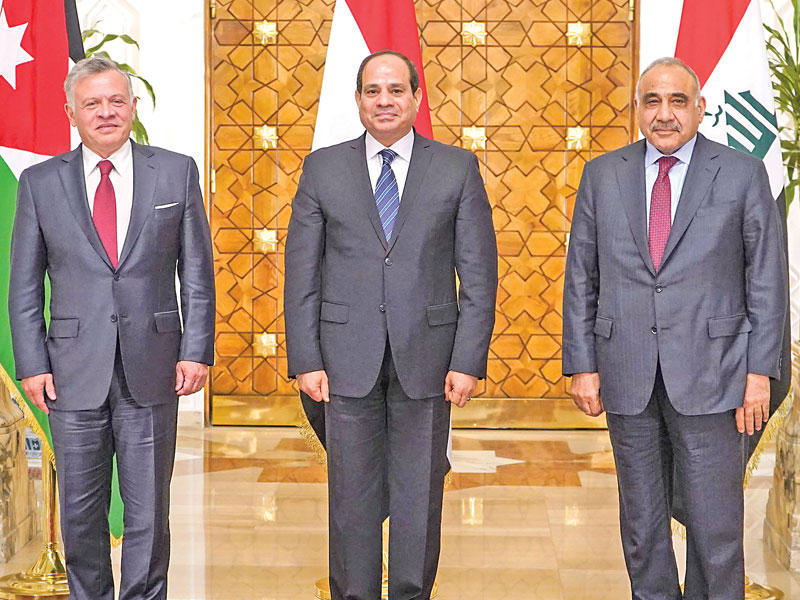 قبل أيام من انعقاد القمة العربية في تونس، ركزت قمة ثلاثية جمعت الرئيس المصري عبدالفتاح السيسي والعاهل الأردني الملك عبدالله الثاني ورئيس الحكومة العراقية عادل عبدالمهدي على التعاون الاقتصادي بعد هزيمة تنظيم «داعش» بما فيها حصول الشركات المصرية على حصة من عقود إعادة إعمار العراق، وتكثيف الدراسة لتسريع مشروع مد أنبوب نفطي من مدينة البصرة عبر الأراضي الأردنية وصولاً إلى جنوب سيناء. ولم يتطرق بيان صادر عقب القمة إلى مشروع الأنبوب النفطي الهادف إلى تصدير النفط العراقي إلى إفريقيا، الذي تم توقيع الاتفاق الخاص به في عام 2014، لكن مصادر مطلعة أكدت أن الموضوع كان مطروحاً على القادة في ضوء تراجع خطر الجماعات الإرهابية في العراق وسيناء. وأفاد البيان بأن القادة ناقشوا تعزيز التكامل والتعاون الاقتصادي بين الدول الثلاث، عبر تطوير المناطق الصناعية المشتركة، والتعاون في قطاعات الطاقة والبنية التحتية وإعادة الإعمار.