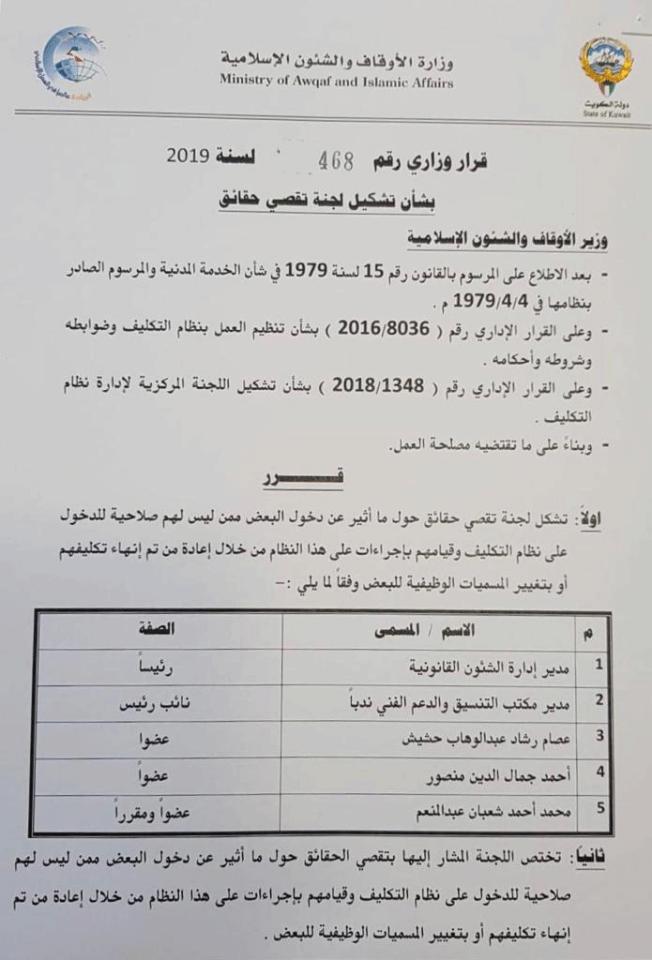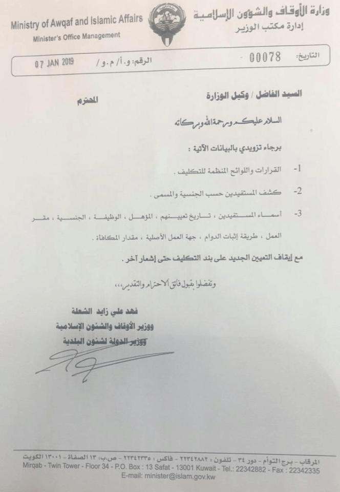 وأكدت المصادر ان الوزير الشعلة أصدر أيضا قرارا بتشكيل لجنة تقصي الحقائق حول ما أثير من دخول البعض ممن ليس لهم صلاحية للدخول على نظام التكليف وقيامهم بإجراءات على هذا النظام من خلال إعادة من تم إنهاء تكليفهم او بتغيير المسميات الوظيفية للبعض، مشيرة الى ان اللجنة برئاسة مدير ادارة الشؤون القانونية.وأشارت إلى ان الشعلة وجه خطاباً الى وكيل الوزارة فريد عمادي يطالب خلاله توضيح القرارات واللوائح المنظمة للتكليف ، وكشف بأسماء المستفيدين حسب الجنسية والمسمى، وتاريخ التعيين لكل منهم والمؤهل العلمي، والوظيفة، وطريقة اثبات الدوام، وجهة العمل الأصلية، ومقدار المكافأة.