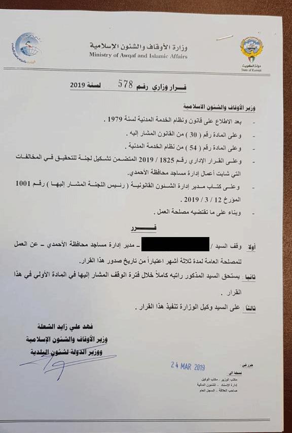 الشعلة يوقف مدير مساجد الاحمدي للمصلحة العامة ويشكل لجنة تقصي حقائق لوجود شبهات في نظام "التكليف"