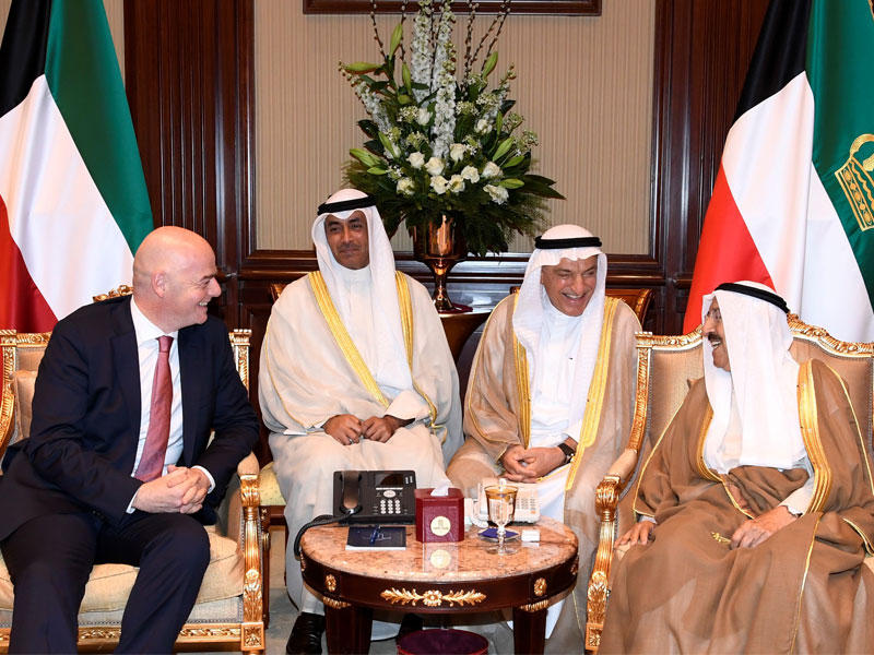 واستقبل سموه، رئيس الاتحاد الدولي لكرة القدم (فيفا) جياني إنفانتينو ورئيس الاتحاد الكويتي لكرة القدم الشيخ أحمد اليوسف، وذلك بمناسبة زيارته للبلاد. حضر المقابلات وزير شؤون الديوان الأميري الشيخ علي الجراح. من جانب آخر، بعث صاحب السمو، ببرقية تهنئة إلى أخيه رئيس دولة فلسطين رئيس اللجنة التنفيذية لمنظمة التحرير الفلسطينية محمود عباس، أعرب فيها سموه عن خالص تهانيه بمناسبة تشكيل الحكومة الفلسطينية الجديدة، متمنيا لأعضائها كل التوفيق والسداد لكل ما فيه خير وخدمة الشعب الفلسطيني الشقيق وتحقيق كافة حقوقه وتطلعاته المنشودة نحو المزيد من التقدم والازدهار، راجيا له موفور الصحة ودوام العافية.وبعث سمو ولي العهد الشيخ نواف الأحمد، ورئيس مجلس الوزراء سمو الشيخ جابر المبارك ببرقيتي تهنئة مماثلتين.