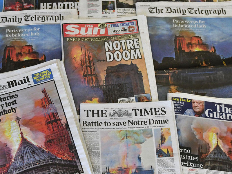 بالإضافة إلى الصحافة الفرنسية العريقة، تفاعلت العديد من الصحف العالمية مع كارثة حريق كاتدرائية نوتردام بباريس، خصوصاً الصحافة الأوروبية. وكتبت صحيفة «ليبراسيون» الفرنسية اليسارية على غلاف صفحتها، الذي نشرت عليه صورة كبيرة لبرج الكاتدرائية وهو يهوي تحت وطأة النيران، عنوان «نوتر درام» (بدل نوتردام) أي «مأساتنا»، في حين عنونت صحيفة «لوفيغارو» اليمينية المحافظة: «الكارثة». وعلى صفحتها الأولى، عنونت صحيفة «ذي غارديان» البريطانية اليسارية «الجحيم يلتهم نوتردام»، وصحيفة «ديلي تلغراف»: «باريس تندب محبوبتها»، بينما عنونت الـ«صن»: «نوتردووم» أي «لعنتنا». وفي إسبانيا، عنونت «البايس»: «النيران تدمر نوتردام رمز الحضارة الأوروبية»، وعنونت صحيفة «ال اوبسرفادور»: الإسبانية «اثنين الرماد»، في إشارة إلى طقس مسيحي لتذكر الموت يجري في بداية الصوم. وكتبت صحيفة «ال جيورنالي» الإيطالية: «11 سبتمبر لأوروبا المسيحية». وفي سويسرا، كتبت صحيفة صحيفة «تريبيون دوجينيف» الناطقة بالفرنسية»: «غير قابلة للإصلاح»، في إشارة إلى حجم الضرر الذي خلفه الحريق.وفي لبنان، عنونت صحيفة الجمهورية بخط عريض على صورة كبيرة للكاتدرائية وهي تحترق: اسبوع الآلام من باريس»، في إشارة إلى الطقوس التي يحييها المسيحيون الكاثوليك، والذين يتبعون التقويم الغربي نهاية الأسبوع الجاري، والتي تمثل الام المسيح قبل صلبه، وتنتهي بالاحتفال بعيد الفصح او القيامة.أما أغرب تفاعل مع المأساة الفرنسية فقد جاء من صربيا الارثوذكسية، واعتبرت صحيفتان صربيتان هما «الو» و«انفورمر» المقربتان من السلطة أن الحريق هو «عقاب إلهي»، مذكرة بأنه تم رفع علم كوسوفو في الكاتدرائية خلال الاحتفالات في الذكرى المئوية لانتهاء الحرب العالمية الاولى. وعنونت الصحيفتان: «أُنزل عليهم العقاب الإلهي»، على موقعهما الالكتروني قبل ان تسحبا المقالين لاحقا. وفي إطار الاحتفالات بذكرى انتهاء الحرب العالمية الأولى، رفعت داخل الكاتدرائية الباريسية اعلام كل الدول التي دعيت للمشاركة وبينها كوسوفو. وتدهورت العلاقات بين باريس وبلغراد بشكل إضافي، حين جلس رئيس كوسوفو هاشم تاجي في 11 نوفمبر إلى جانب المدعوين على منصة الشرف فيما كان نظيره الصربي الكسندر فوسيتش في مقعد خلفي. في المقابل عبر الرئيس الصربي عن دعمه لفرنسا، مؤكدا أن «كل مواطني صربيا يشعرون بالحزن»، ويقفون الى جانب «اصدقائهم الفرنسيين». وأكد أن بلاده مستعدة للمساعدة «في إعادة بناء هذا الرمز للحضارة الفرنسية والعالمية».حقائق
