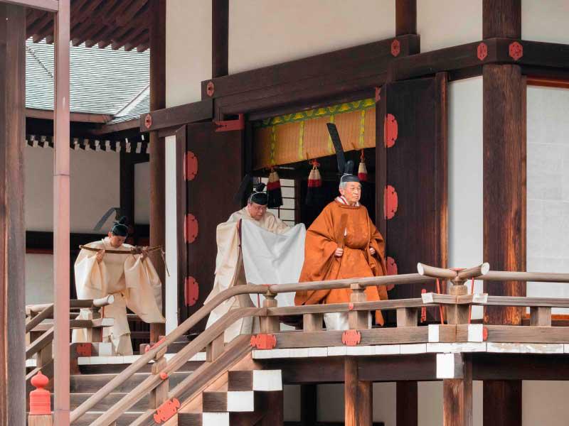 وتم إحضار "الكنوز المقدسة" في علبها لحمايتها بعناية من الأنظار. وتقول الأسطورة إن عمر هذه الكنوز يتجاوز آلاف السنين وإنها نُقلت إلى السلالة الإمبراطورية بواسطة آلهة الشمس أماتيراسو.وهذه الكنوز هي "ياتا نو كاغامي" أي مرآة، و"كوساناغي نو تسوروغي" ويعني ذلك سيف، و"ياساكاني نو ماغاتاما" أي جوهرة مجهولة. إلا أن الكنز الأول لن يكون ضمن المراسم، إذ إنه لا يُنقل من مكان حفظه في القصر. ويُعتبر امتلاك هذه الكنوز الثلاثة دليلاً أساسياً على شرعية الإمبراطور، لكن ليس هناك صور لها، حتى إن الإمبراطور نفسه لا يمكن أن يراها.وشارك أكثر من 300 شخص في هذا الاحتفال، وأفراد من العائلة الإمبراطورية وأعضاء في الحكومة والبرلمان والسلطة القضائية والسلطات المحلية.
