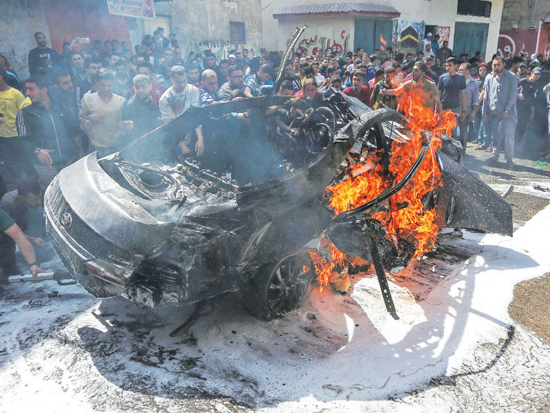 وبينما دعا وزير الأمن الداخلي الإسرائيلي جلعاد أردان إلى العودة لاغتيال قادة «حماس» و«الجهاد»، استهدفت غارة إسرائيلية سيارة القيادي في «حماس» حامد أحمد عبدالخضري، في أول اغتيال لقيادي فلسطيني منذ 2014، مما أدى إلى مقتله.وقال الجيش الإسرائيلي إن الخضري كان مسؤولاً عن نقل الأموال من إيران إلى الفصائل المسلحة في غزة.في المقابل، أُطلقت دفعة جديدة من الصواريخ، أمس، من قطاع غزة على إسرائيل، وأدى إطلاق نحو 500 صاروخ إلى مقتل 3 إسرائيليين، في وقت تبنت «كتائب عزالدين القسام»، الجناح العسكري لـ «حماس» إصابة حافلة إسرائيلية بصاروخ موجه مطور محلياً، مما أدى إلى مقتل ضابط استخبارات إسرائيلي وإصابة جنود كانوا برفقته.وبينما أعلنت «غرفة العمليات المشتركة» في غزة أنها قصفت مدن بئر السبع وعسقلان وسديروت جنوب إسرائيل بعشرات الصواريخ، أوقفت السلطات الإسرائيلية حركة القطار في بئر السبع بعد إصابة مباشرة لسكة الحديد.وأصيب مستوطن بجروح خطيرة من جراء سقوط صاروخ على سيارة في سديروت، في حين أُصيبت امرأة بسبب سقوط صواريخ، وجرى إغلاق مناطق أمام حركة السير في بئر السبع.
