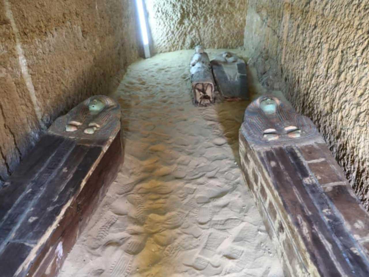 كما عثرت البعثة، داخل المقبرة على توابيت مغلقة، لم يتم فتحها نهائيا، إلى جانب عدد من اللقى الأثرية الخاصة بالكاهنين.وأوضح الأمين العام للمجلس الأعلى للآثار، د. مصطفى وزيري، أن الجبانة تضم العديد من آبار الدفن والمقابر التي تعود إلى عصر الدولة القديمة، وتؤرخ أقدم مقبرة تم الكشف عنها في الموقع الى عصر الأسرة الخامسة (حوالي 2500 سنة قبل الميلاد)، وتمثل مقبرة جماعية شيدت من الحجر الجيري، لشخصين يدعى أحدهما "بحنوي - كا" والآخر يدعى نوي. وأضاف وزيري أن من أهم ما عثر عليه داخل المقبرة تمثال من الحجر الجيري في حالة جيدة من الحفظ، يمثّل صاحب المقبرة وزوجته وأحد أبنائه، ولا يحتوي التمثال على أي نقوش.وقال مدير منطقة آثار الهرم أشرف محيي، إنه أعيد استخدام هذه الجبانة للدفن على نطاق واسع في العصر المتأخر، بداية من القرن السابع قبل الميلاد، حيث عثر بداخلها على العديد من التوابيت الخشبية ذات الأشكال الآدمية تعود إلى ذلك العصر، مشيرا إلي أنها توابيت ملونة بألوان زاهية ومزخرفة بزخارف متنوعة. ويحتوي بعضها على شريط طولي بالكتابة الهيروغليفية يتوسط غطاء بعض تلك التوابيت، كما تم العثور على العديد من أوجه الأقنعة الخشبية والطينية الملونة.