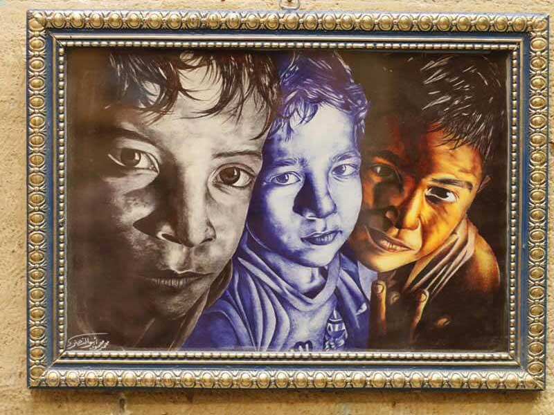 وبوجه عام، جسّدت لوحات المعرض، أماكن تعبّر عن الهوية المصرية، وطغى عدد من لوحات فن "البورتريه" التي تناولت وجوهاً بسيطة من المجتمع المصري، يظهر على ملامحها مشاعر مختلفة بين الفرح أحياناً والشقاء في أحيان أخرى، إلى جانب بورتريهات لشخصيات دينية وفنية معروفة، وكأنها رسالة واضحة مفادها أن رجل الدين والفنان ليسا على خلاف، وأن لكل منهما دورا مهما في المجتمع.أطفال يعزفون