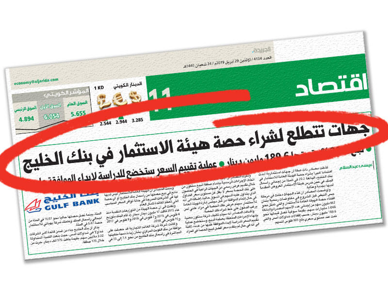 وأوضحت المصادر أن الهيئة العامة للاستثمار كلفت الشركة الكويتية للاستثمار لتكون معنية بإنهاء الإجراءات المتعلقة بعملية البيع، وستخضع عملية تقييم السعر للدراسة لإبداء الموافقة عليها من عدمها، موضحة أن الآلية المتبعة لإتمام الصفقة في حال اتخاذ الإجراءات الرسمية بإتمام صفقة البيع ستكون من خلال تقديم عرض رسمي من الجهات الراغبة في الحصول على تلك الحصة بسعر لا يقل عن مستوى سعر التداول الذي يتداول عليه السهم في السوق حاليا، إضافة الى أنه في حال إتمام الموافقة من قبل مجلس إدارة الهيئة سيتم عرض تلك الحصة في مزاد علني لمن يرغب الدخول على خط شراء تلك الحصة.ولفتت الى أنه في حال لم يتقدم سعر أفضل لبيع الحصة في المزاد ستتم الترسية على الراغب في شراء الحصة.وذكرت المصادر أنه حسب اقفالات السعر السوقي لسهم بنك الخليج أمس، تقدر القيمة السوقية لحصة هيئة الاستثمار في بنك الخليج بنحو 150.4 مليون دينار، وفقا لملكيتها المباشرة البالغة 16.08 في المئة من اجمالي رأسمال البنك، بينما تتملك نحو 4 في المئة عبر ملكية غير مباشرة. وبينت المصادر أنه تمت زيادة رأسمال البنك في مطلع 2009 من خلال إصدار أسهم جديدة بهدف إعادة رسملته، وتمكن البنك في نهاية عملية الاكتتاب من حشد مبلغ 376 مليون دينار ابان خسائر المشتقات عام 2018، من خلال طرح أسهم زيادة رأس المال للاكتتاب فيها من قبل المساهمين، كل بحسب نسبة مساهمته في رأس المال قبل الزيادة، وبسعر 300 فلس للسهم الواحد. واكتتب مساهمو البنك آنذاك بما نسبته 68 في المئة من هذه الأسهم الجديدة بقيمة 255 مليون دينار، في حين تم تخصيص النسبة الباقية للهيئة العامة للاستثمار بما يعادل 32 في المئة وبقيمة تعادل 120 مليون دينار، ومن ثم أصبحت الحصة النهائية لهيئة الاستثمار في رأسمال البنك بعد إعادة رسملته 16 في المئة. وكان سعر السهم السوقي قد ارتفع خلال الايام الماضية الى 316 فلسا للسهم، لكنه تراجع لاحقاً وأغلق أمس على سعر 307 فلوس للسهم، بكمية 22.22 مليون سهم، بقيمة 6.8 ملايين دينار نفذت من خلال 230 صفقة.وقالت المصادر إن سهم «الخليج» عاد الى توزيع أسهم المنحة منذ عام 2012 تقريباً الى ان بدأ التوزيع النقدي في عام 2015، حيث فاقت حصة الهيئة من التوزيعات النقدية منذ عام 2015 نحو الـ22 مليون دينار، إذ قام البنك بتوزيع 4 فلوس في 2015 و7 فلوس في 2016 و9 فلوس في 2017 و10 فلوس في 2018. وخرجت المؤسسة العامة للتأمينات الاجتماعية من قائمة كبار ملاك بنك الخليج في 19 مارس الماضي، لتصبح ملكيتها في سهم البنك دون 5 في المئة، بينما ظلت ملكية الهيئة العامة للاستثمار عند مستوى 20.2 في المئة.